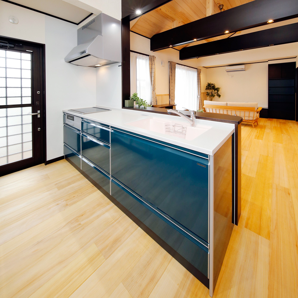 広々としたカウンタースペースが魅力のシックなブルーグリーンが印象的な対面キッチン -事例写真「光舞う、テラスリビングがここちいい家」注文住宅のハウスネットギャラリ。