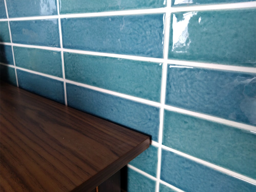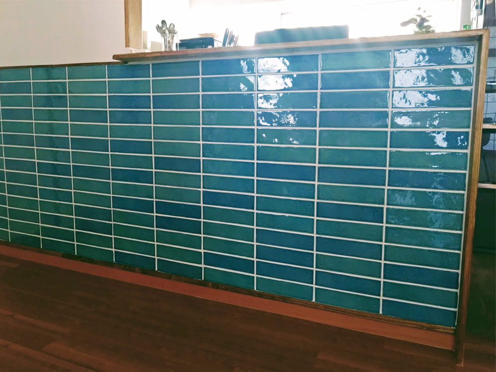 最新施工事例『tone』のキッチン ブルーグリーンの縦長の亀甲型のタイル 白い四角形のタイルをアクセントに キッチンの天板はモールテックスで仕上げました全ての写真は、HPからどうぞ! @anestoneanestoneアネストワンリノベーションリノベーション愛知。