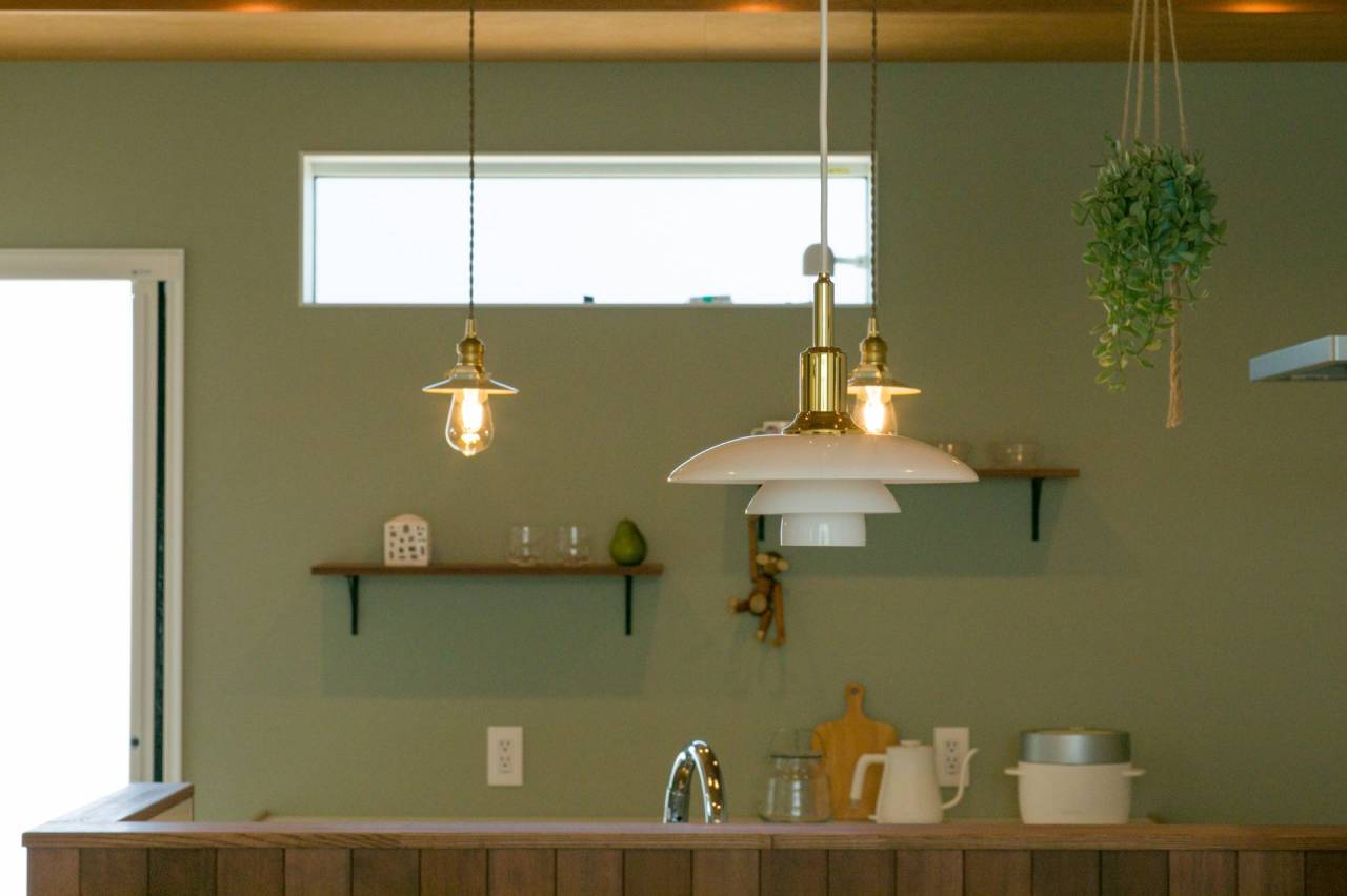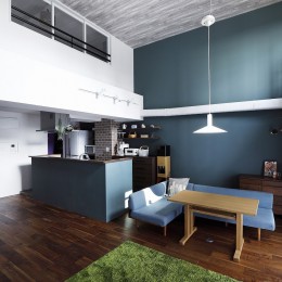 ブルーグリーンの壁が印象的な対面キッチン 溶け合うテイスト- リビングダイニング事例SUVACO スバコ。