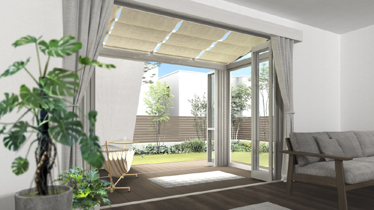 埼玉県さいたま市 庭リニューアル おしゃれ サンルーム ココマ 日除けシェード。