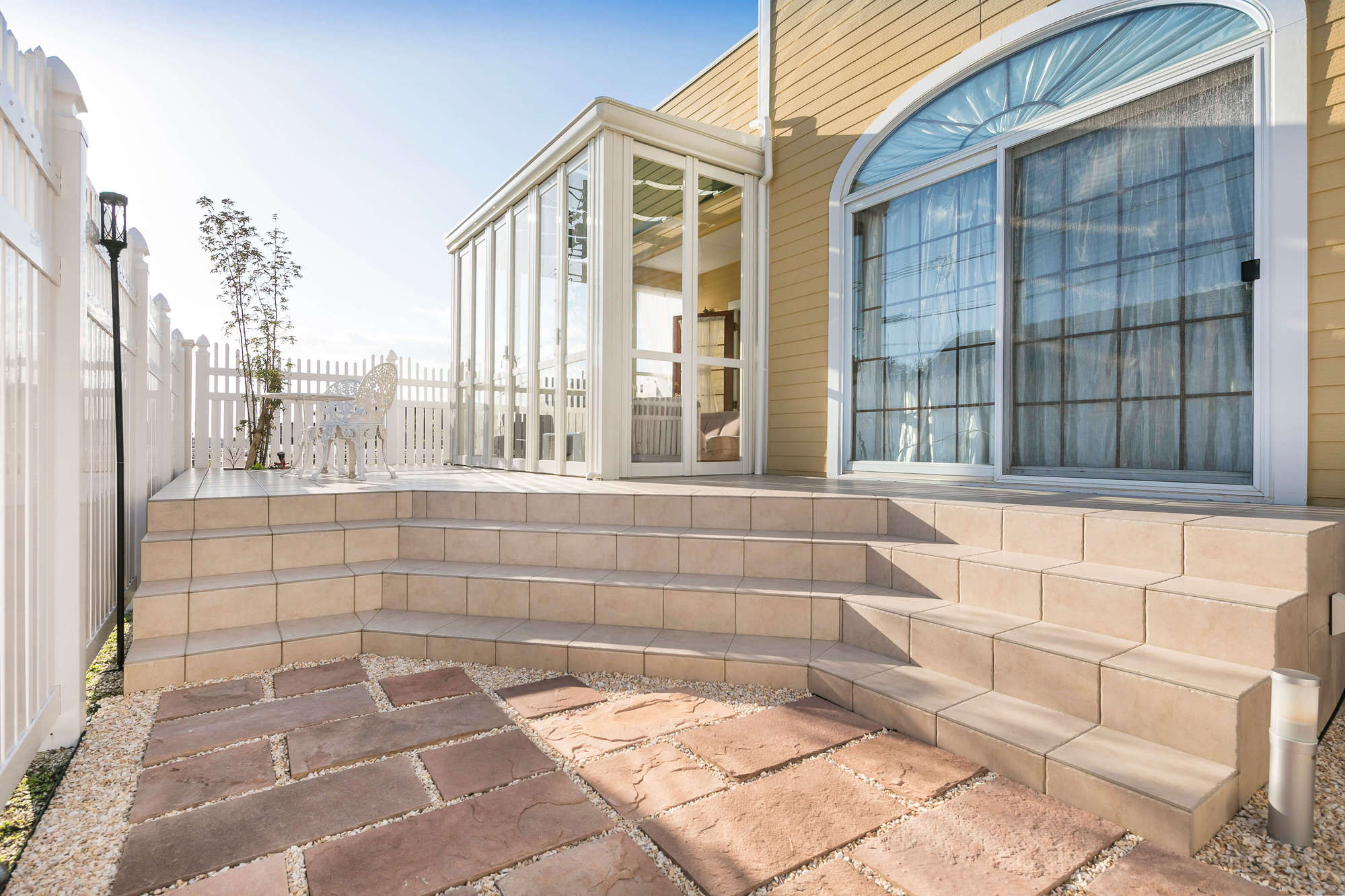 東京都八王子市 K様邸 サンルーム暖蘭物語 ・木樹脂のウッドデッキ・庭の植栽エゴの木の白花も映えます。エクステリア・外構工事なら町田市のエクステリアスタイル.com。
