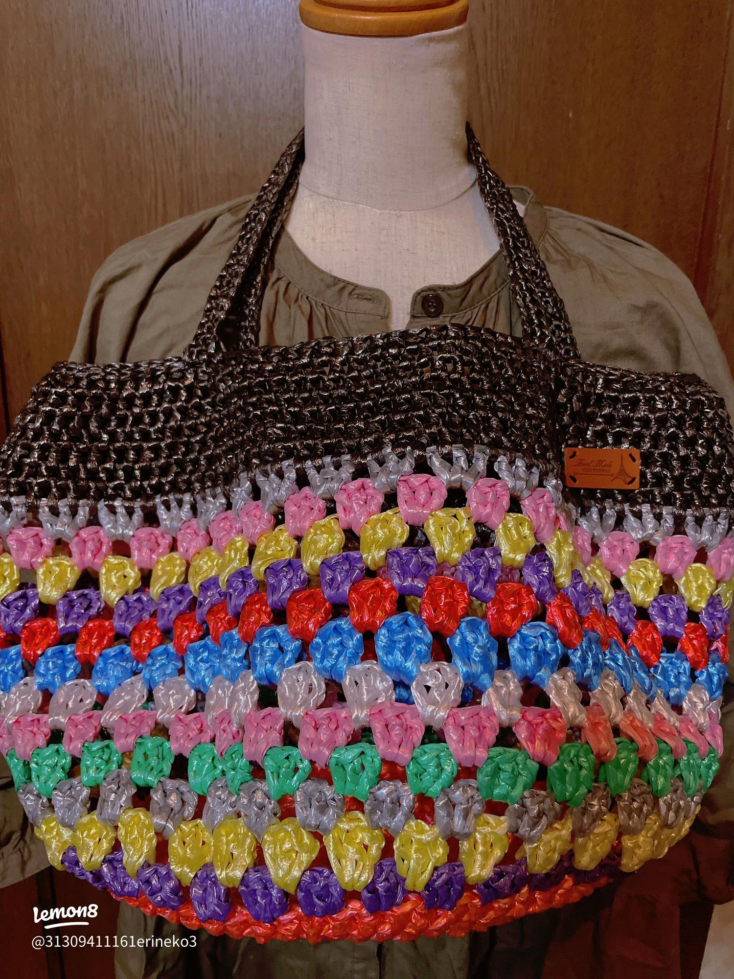 荷造り用のビニール紐で 松編みバック完成しました *^^*san amiamiさん動画参考ハンドメイドビニールバッグTikTok。