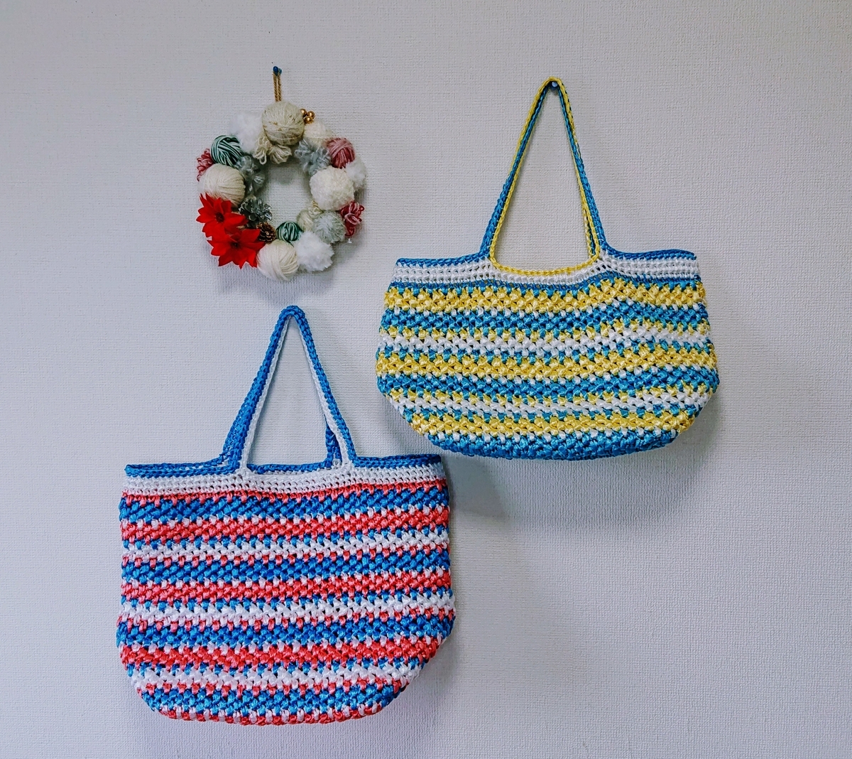 夏におすすめしたいバッグがこれ。 荷造り用のビニール紐を毛糸代わりに編んで作るバッグです。 ポンポンを作るビニール紐と言ったらわかるかな?スズランテープという商品名のものは様々な色があってニッターさんの間では人気があるみたいです。 ビニール紐なので濡れて。