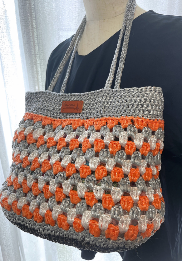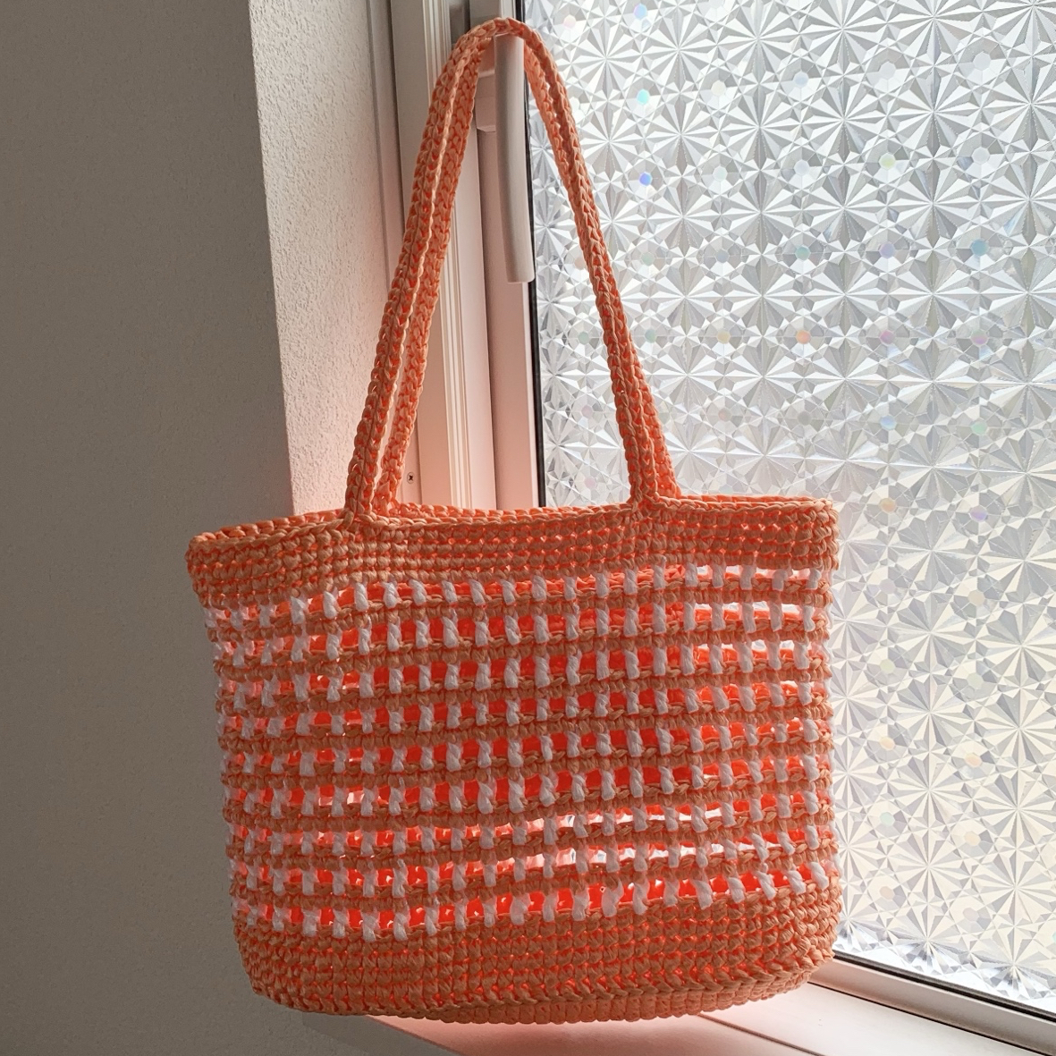 ビニール紐で模様編みのバッグ - ビニール紐クロッシェ。