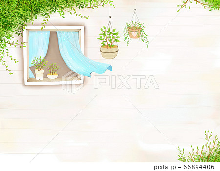 爽やかな白壁と風になびくカーテンと植木鉢が描かれたイラスト "のイラスト素材66894406- PIXTA。