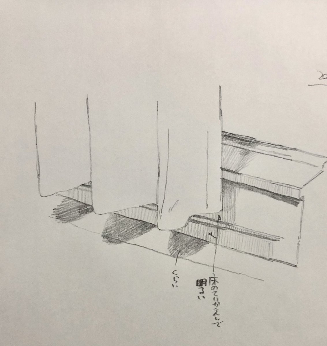 絵描きのための発見図鑑 カーテンの影。床の方が暗くて、壁の方 が明るい。床の反射光が壁の影を明るくしてるのかな。影をつける時は分かりやすい光源以外の反射光も見つけられるとリアリティ増すなぁ。