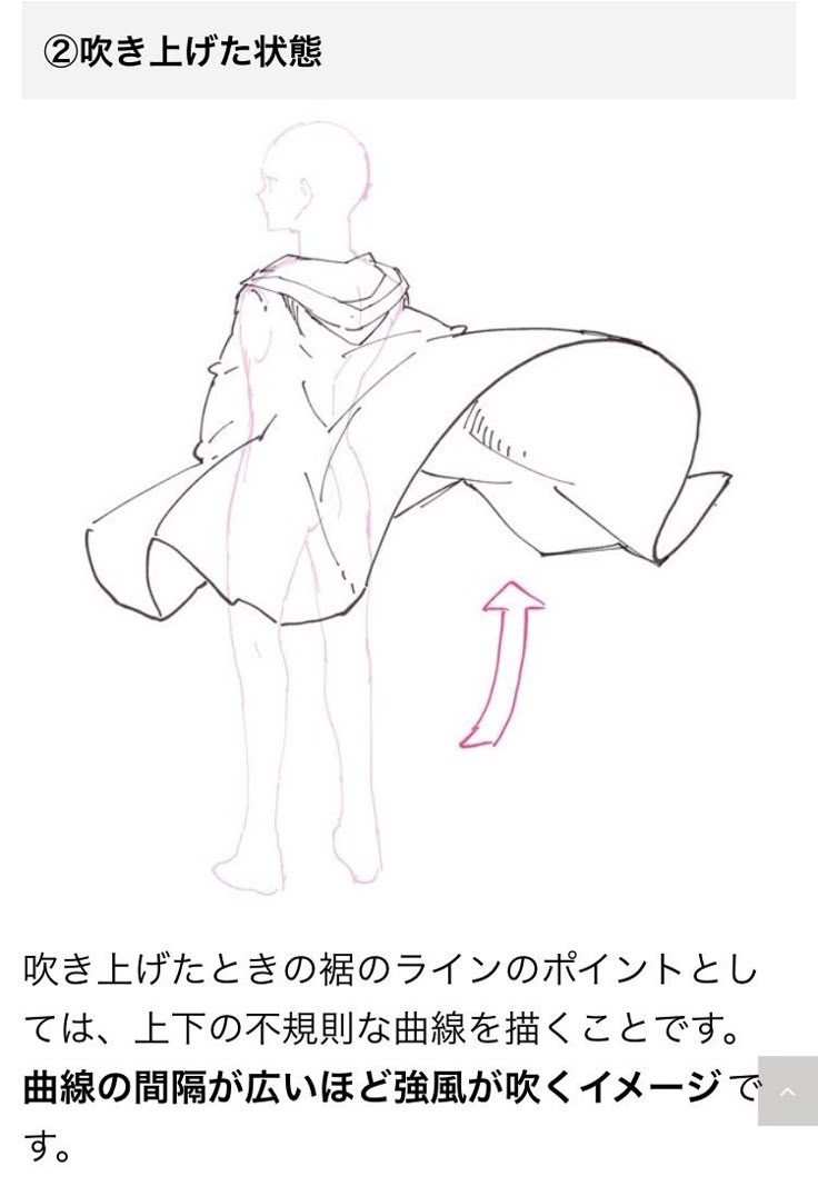 自然なマントの描き方 マントをなびかせるときは、風がどちらから吹いているか、布のアウトラインがどうなっているかを考えると、なびき方 のコンセプトを考えやすくなります。派手になびくマントは、キャラクターのシルエットや構図をダイナミックに見せることができます。