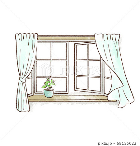 出窓に置かれた観葉植物と風になびくカーテンのイラスト素材69155022- PIXTA。