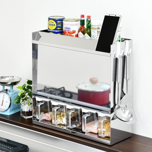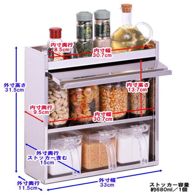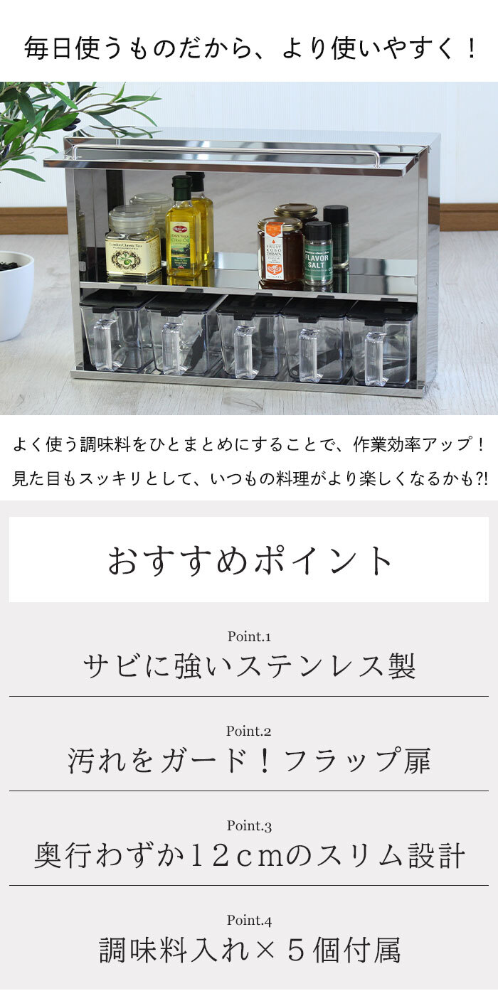 楽天市場 調味料入れ スパイスラック ステンレス フラップ扉 ストッカー2個付 おしゃれ 調味料ラック 隠す 薄型 スリム キャビネット カウンター上収納棚 完成品 おすすめ キッチン 便利グッズ 燕三条 日本製送料無料: プラスチック収納用品専門店 MJ。
