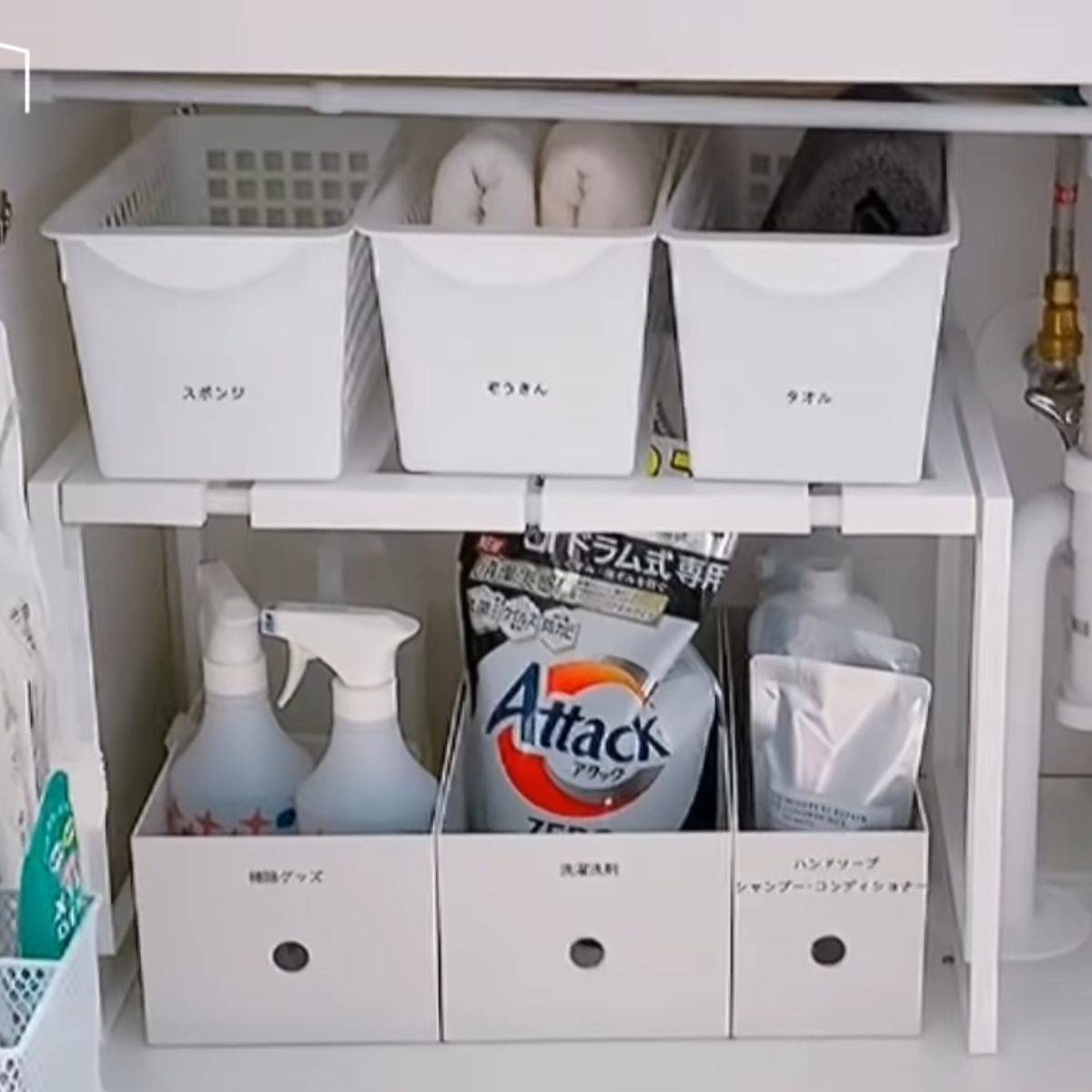 洗面下フリーラック 伸縮タイプ洗面所 収納棚 シンク下 収納 洗面台 キッチン シンク下収納 伸縮式 キッチンラック 排水管 排水管避け パイプパイプ避け 給水管 給水管避け シンク下ラック。