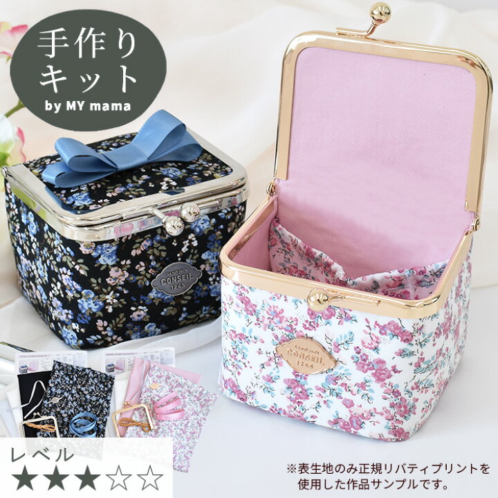 手作りキット リバティプリント で作る 小さめ ボックス がま口 小物入れ レシピ 型紙 動画 付き ゆうパケット送料無料 ■ LIBERTYFABRICS 花柄 化粧ポーチ コスメポーチ メイクポーチ 口金 手芸キット 手芸 手作り LV3 中級 ■手作り工房MYmama エムワイママ。