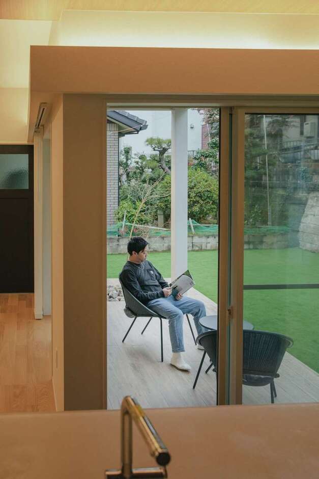 室内と庭をつなぐタイルテラスは、メンテナンスフリーで掃除もラクラクくふうイエタテ。