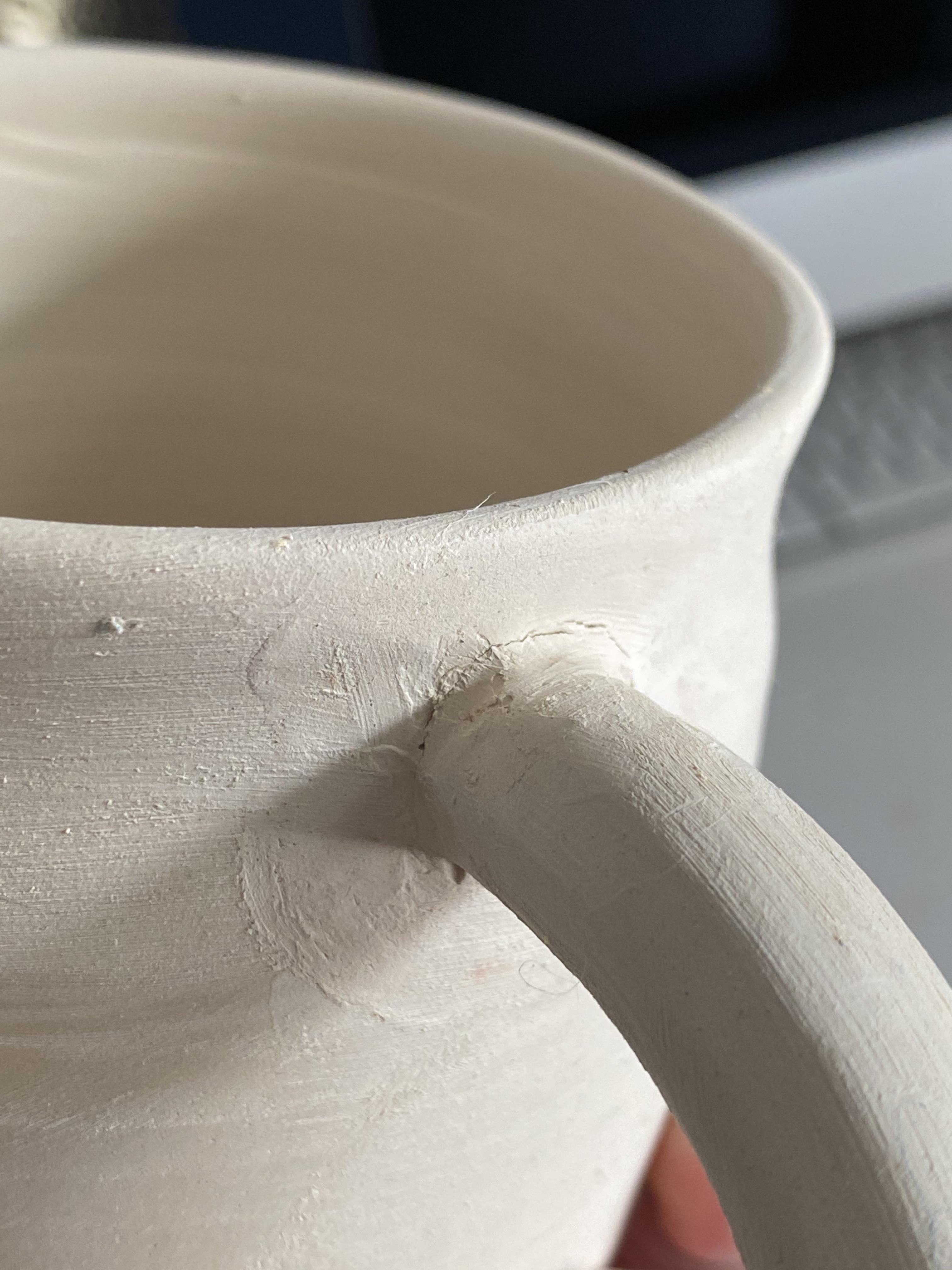 初心者です! このマグカップに取っ手をつけた後、固定したところに髪の毛ほどのヒビが入っているのに気づきました。削ってスリップを使ったんですが、粘土が乾燥しすぎていたとは思わないんですが、何か間違ったことをしたんでしょうか? 焼く前に 周りに粘土を足す。