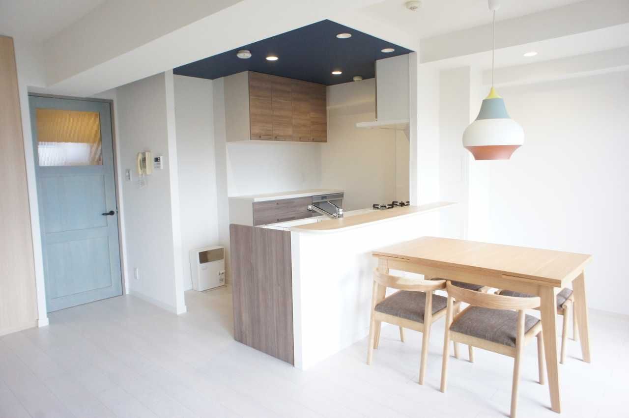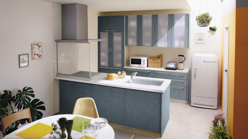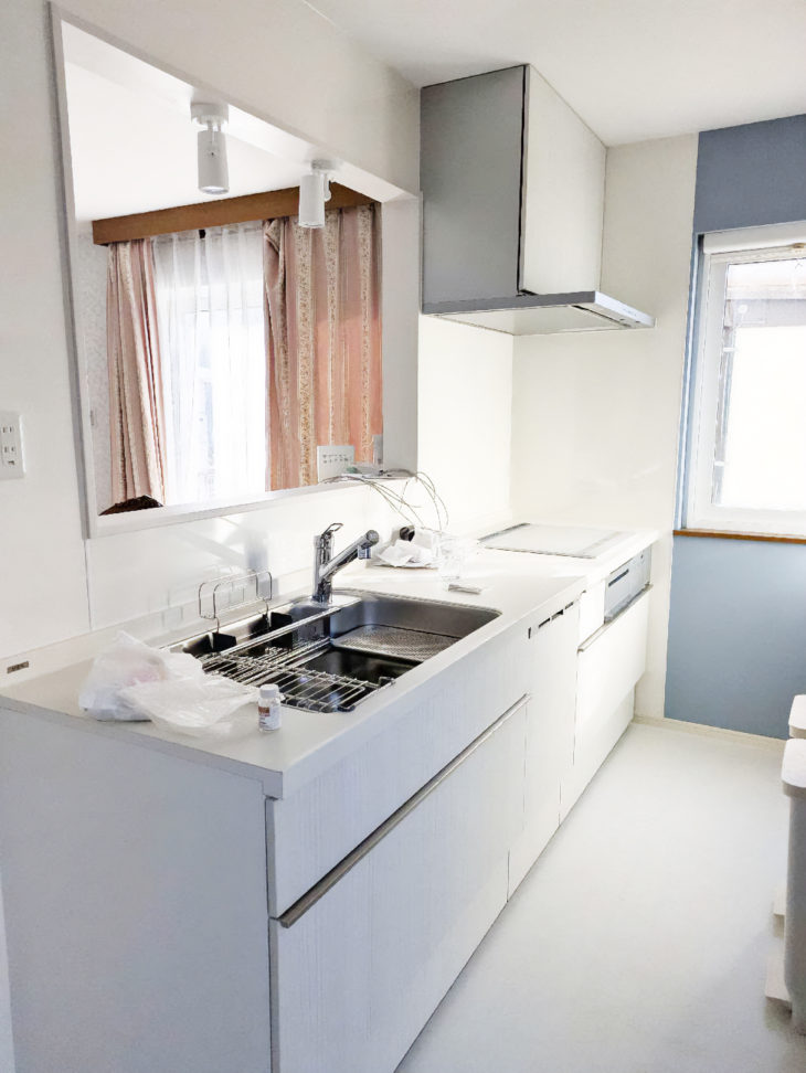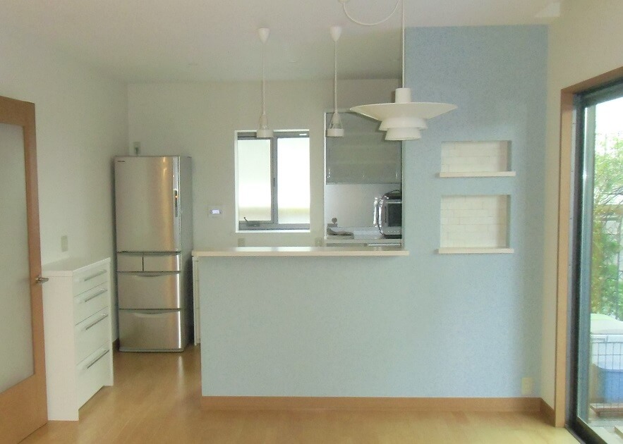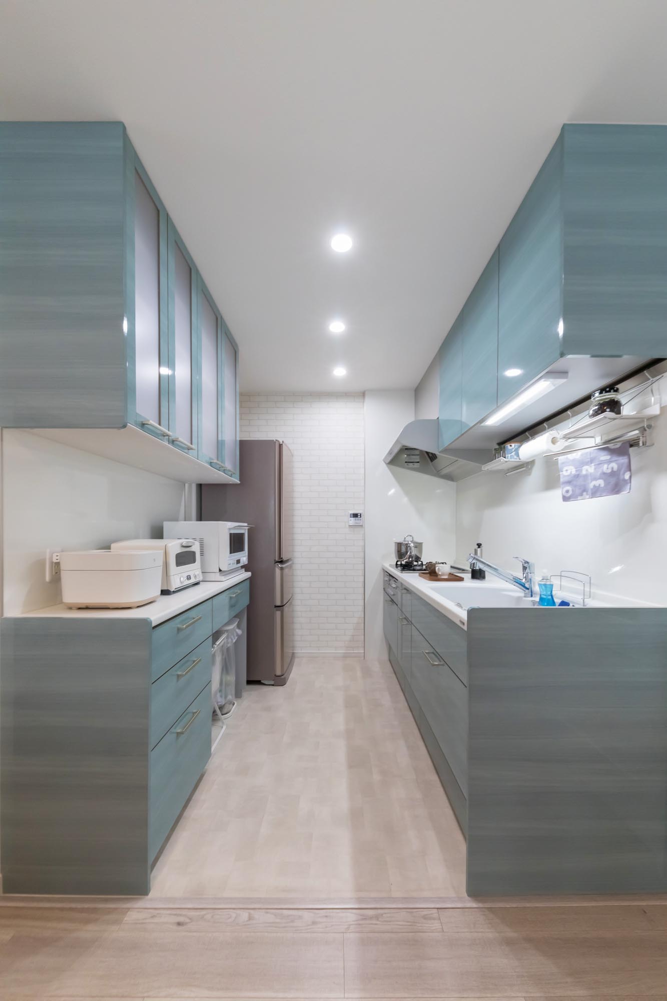 北欧テイストの薄いブルーパネルのキッチンリフォーム。