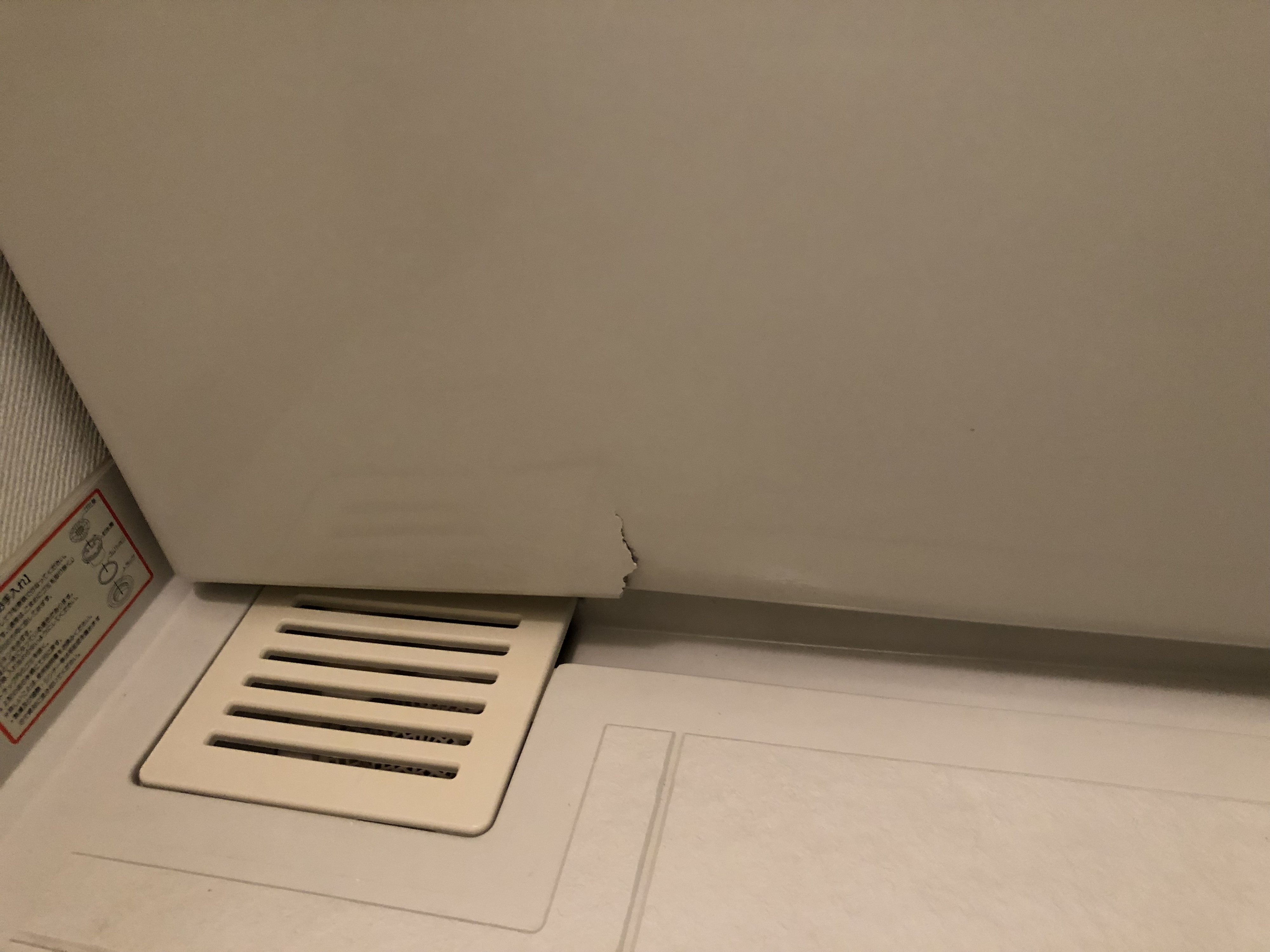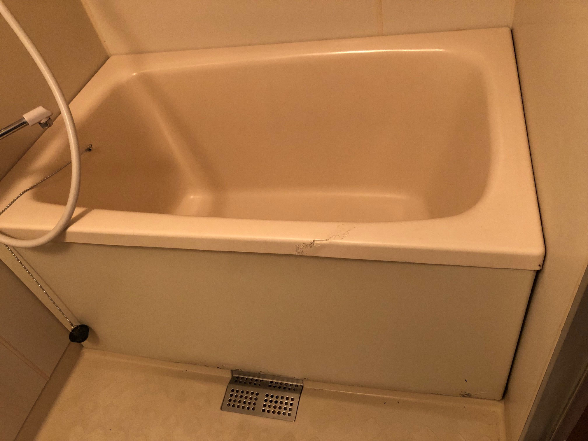 熊本県八代市、賃貸マンション、ユニットバス浴室、FRP製エプロン割れ修理及び塗装。