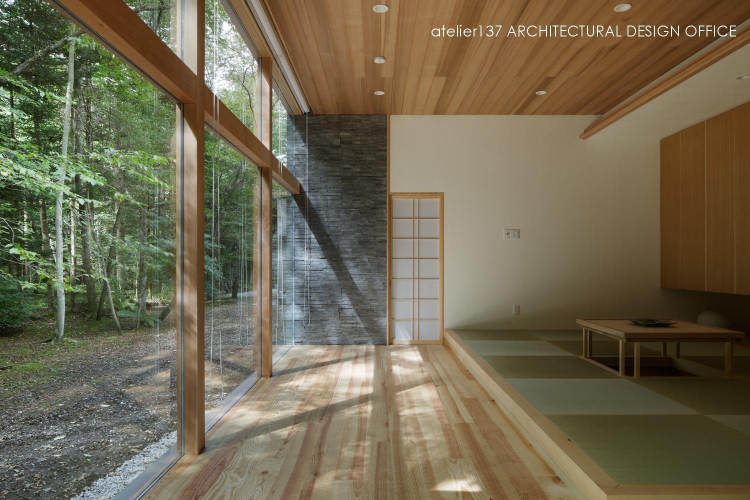 大開口の窓から見える緑と、木目調の壁紙が落ち着きを演出する和モダンの和室 - 事例写真「丸亀モデルハウス×香川県」注文住宅のハウスネットギャラリ。