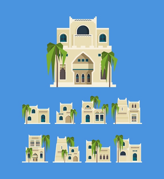 砂漠のアラビアの建物。エジプトの古代の古い伝統的な家屋レンガ建築物古い家屋。イラスト構造砂岩の家、歴史的建造物の砂漠Premiumベクトル素材。