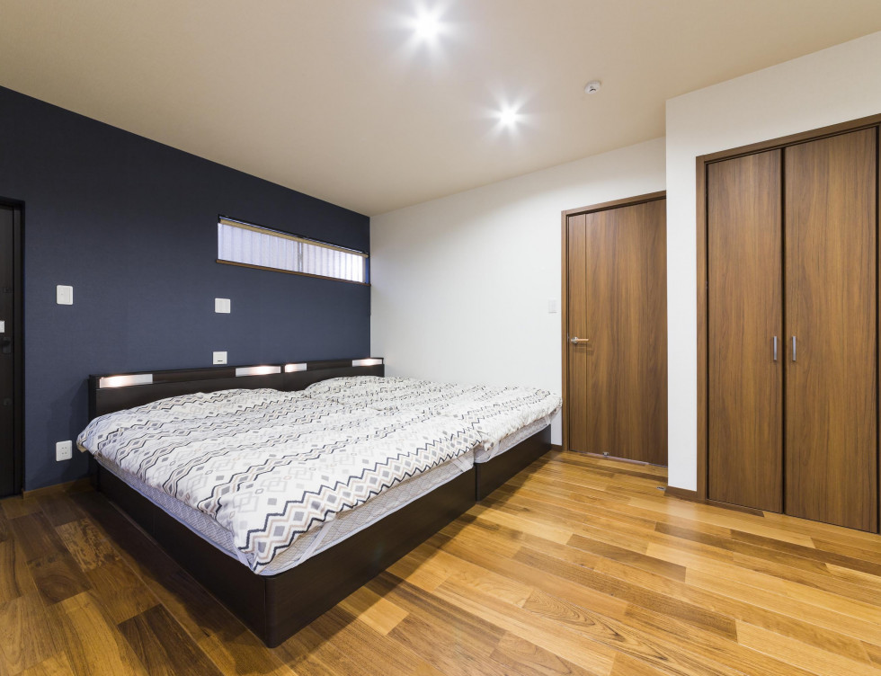 おしゃれで快適なベッドルーム寝室navy青紺男前インテリア青の部屋洋室デザイン寝室 インテリア福岡工務店新築一戸建て注文住宅自由設計。