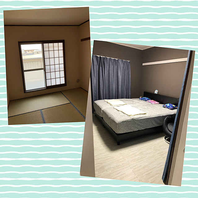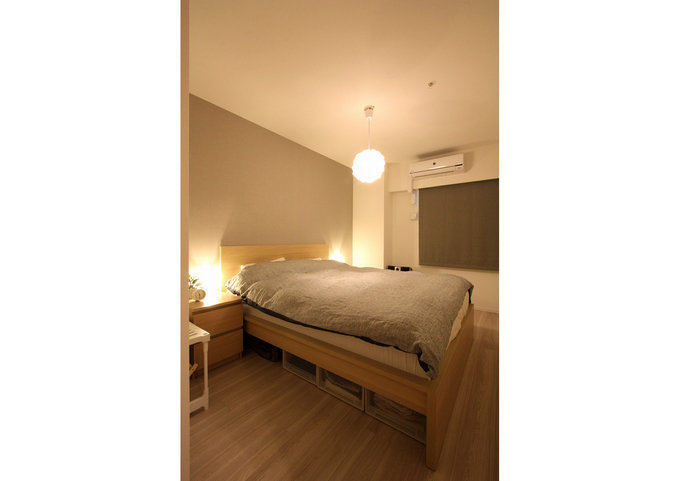 和室を洋室に。落ち着いた寝室が完成! 6帖の和室だった場所を洋室にリフォームしました。 寝室で使用されるという事でグレー調の壁紙をチョイス。暗くなりすぎないように、床と天井は明るい色を選びました。 ロールスクリーンの濃い茶色がが締め色になり。
