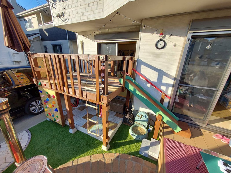 人工木アドバンスデッキの遊具付きウッドデッキ - リーベDIYウッドデッキ大賞。
