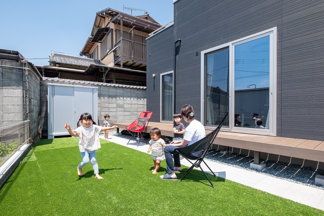 ウッドデッキもある広い庭は子供たちの絶好の遊び場。イデキョウホームわたしの住まい みんなの暮らし。
