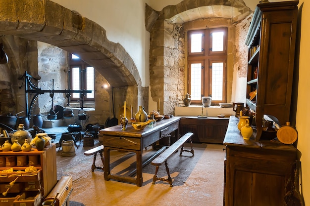 古代の城、ヨーロッパのビンテージ キッチン ルーム。伝統的なヨーロッパの建築、観光や旅行の有名な場所、中世の料理のインテリア、食器、調理器具Premium写真。
