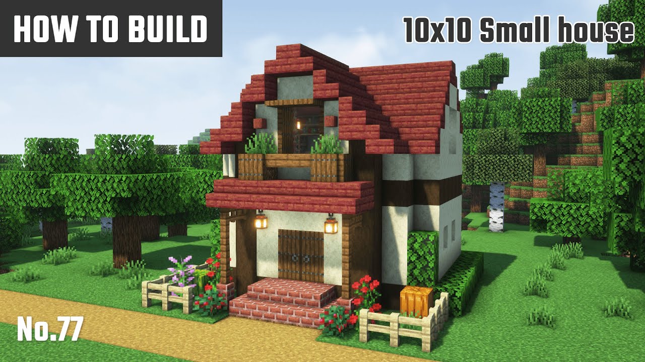 マイクラ建築:暖炉のあるおしゃれな赤い屋根の家。庭に花畑。簡単10×10。No.77SOUのマイクラログ。