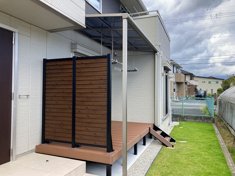 腐らないウッドデッキと目隠しフェンスリフォーム安く人工木デッキエコなデッキ布団が干せる外構・エクステリア・造園は庭づくり専門店 愛知県扶桑町 池之上造園へ。