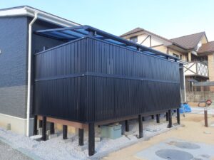 No474お庭のデッキ周りに設置した人工木目隠しフェンス 黒目隠しフェンス・ウッドデッキ専門店のエコウッド。