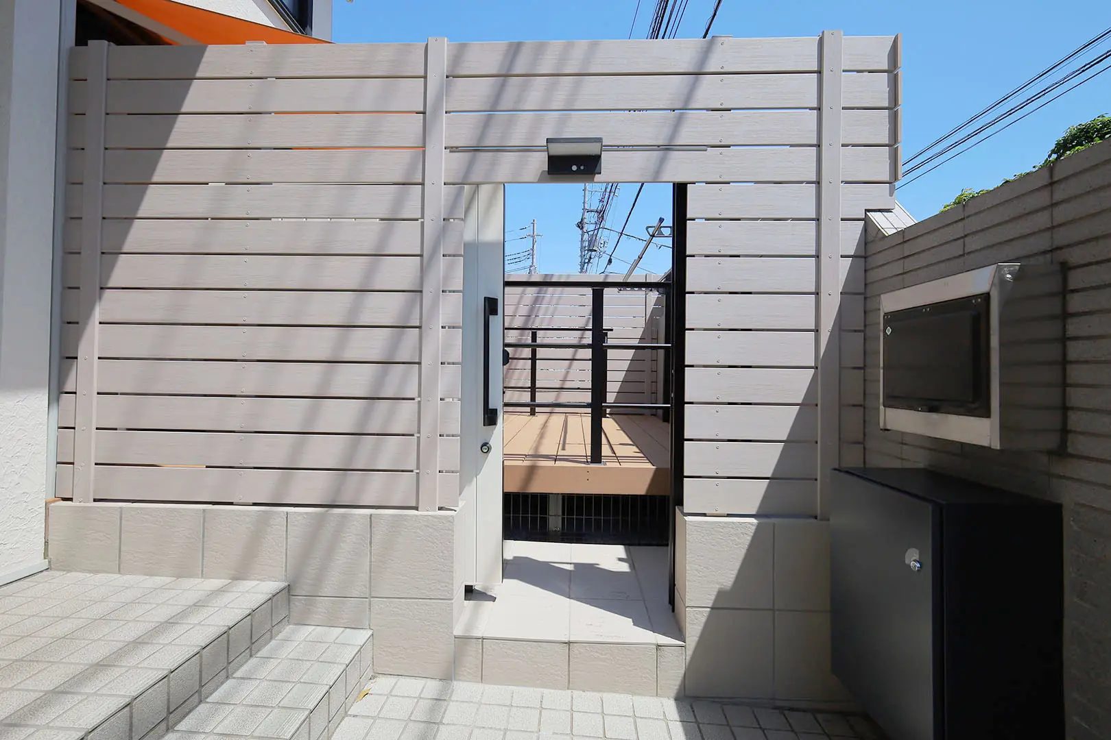 高さのある扉とスリットフェンスを組み合わせた目隠しフェンスグリーンケアお庭のデザイン&リフォーム。