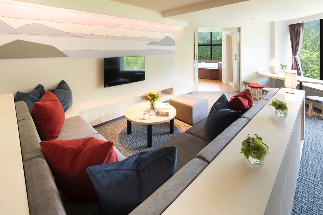 リゾナーレトマムのスイートフォースルームは、全室120平米、展望ジェットバスとプライベートサウナ付き。リビングと2つの寝室があり、大人数のご家族でもお部屋でゆっくりとお寛ぎいただけます。6月1日からグリーンシーズンの営業開始予定です。hoshinoresortstomamu。