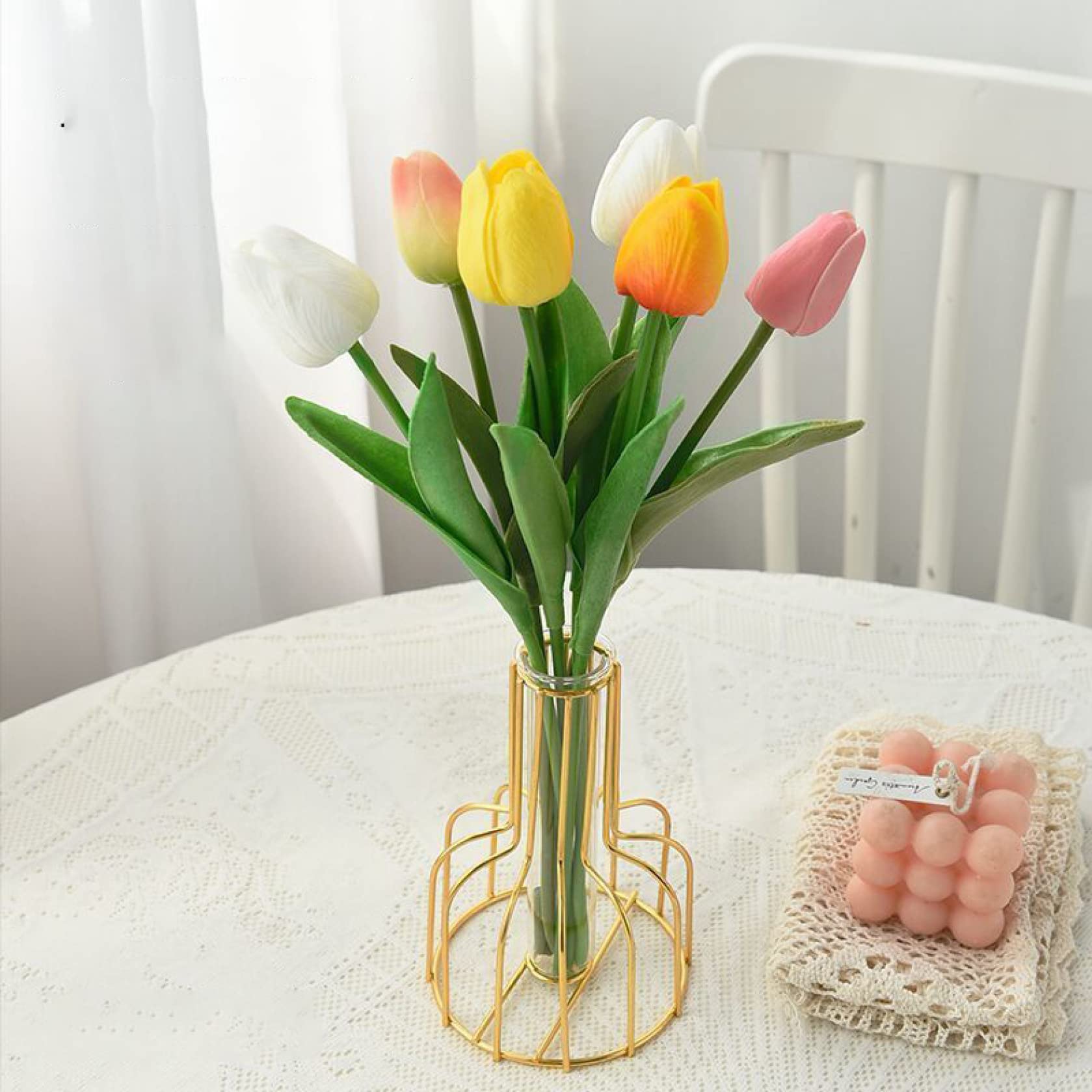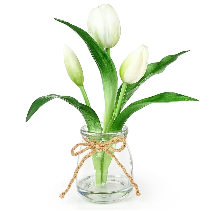 Lovmeety チューリップ 造花 ガラスの花瓶 フェイクウォーター 本物の手触り 白いチューリップ 花瓶付き フラワーアレンジメント テーブルセンターピース デコレーション ホーム キッチン オフィス ウェディング用。