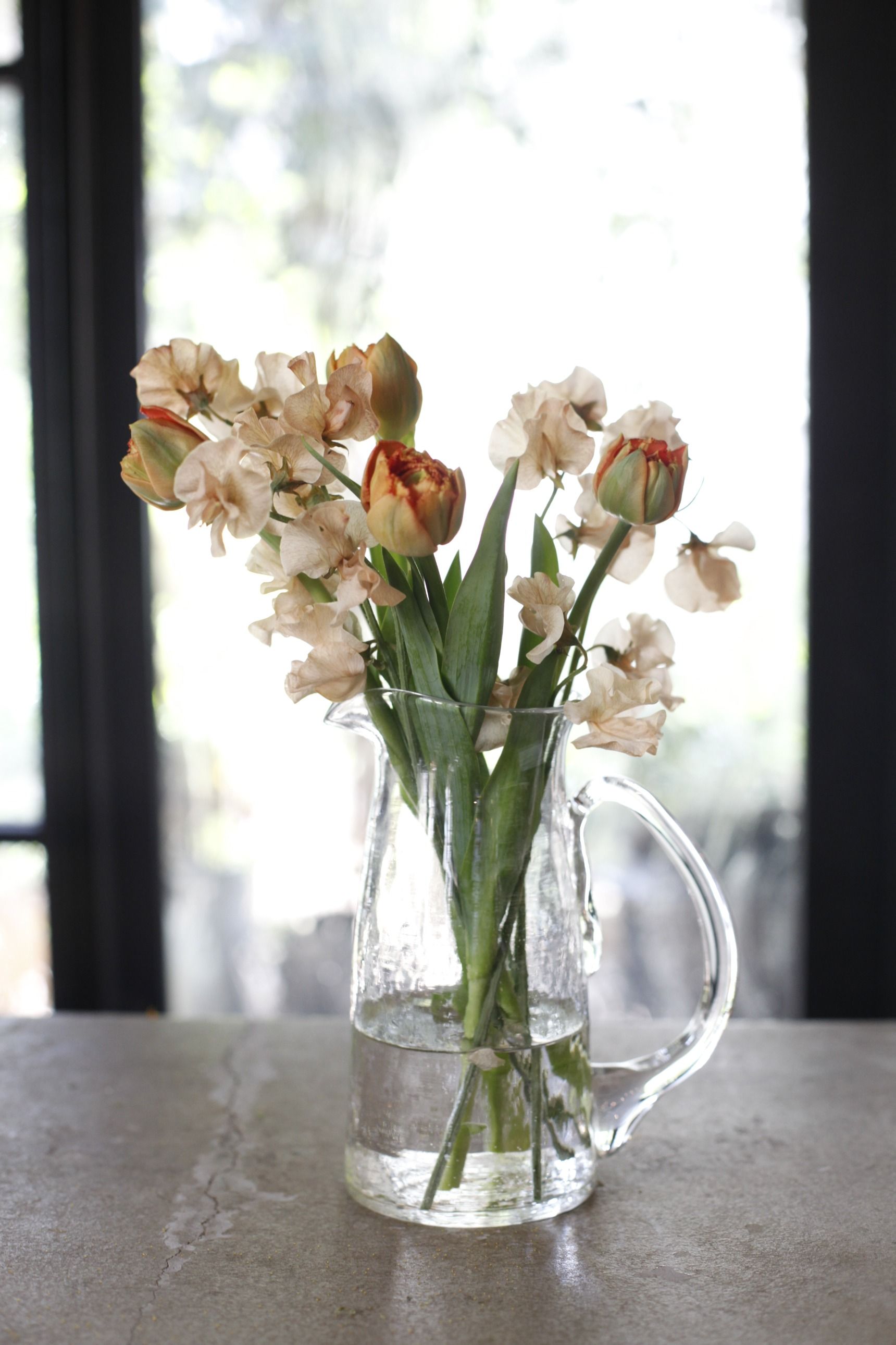 チューリップ 桜 花瓶 春の投げ入れ。チューリップと桜を花瓶に生けました フラワーアレンジメント教室 横浜。