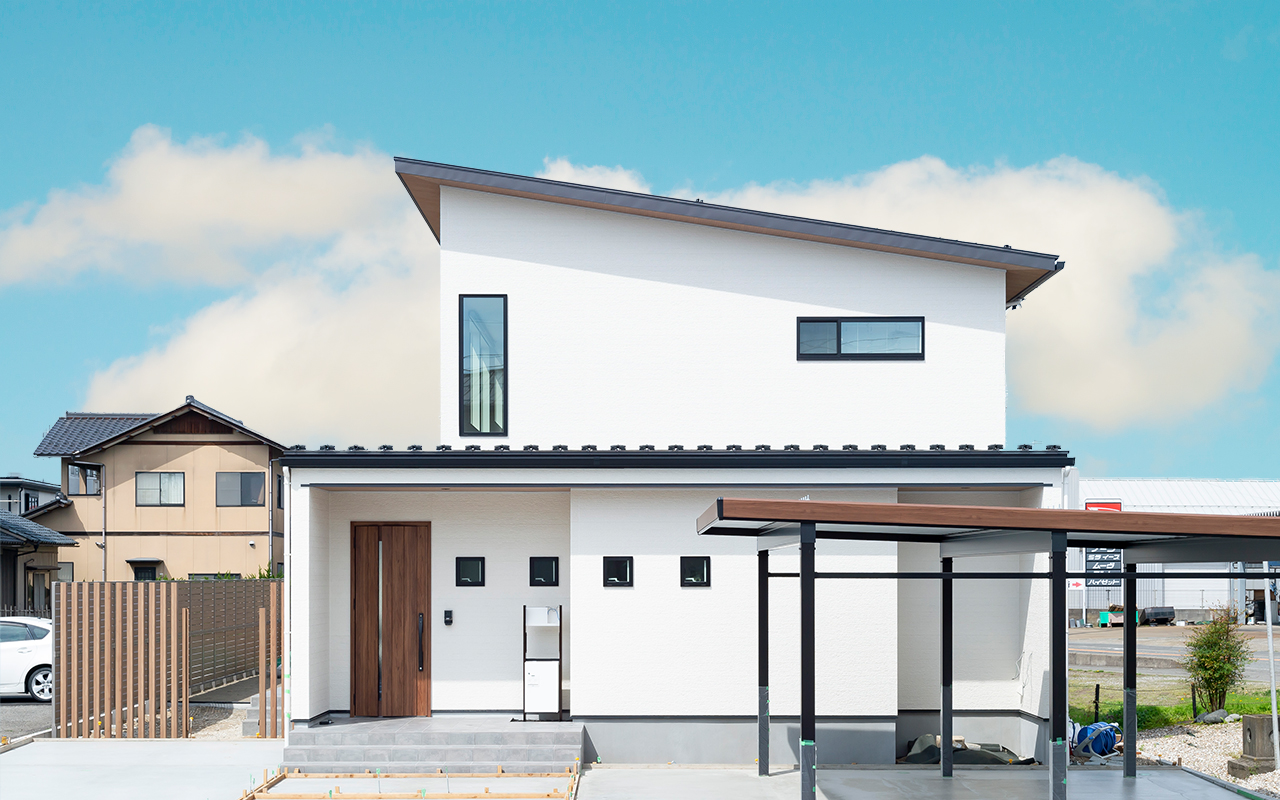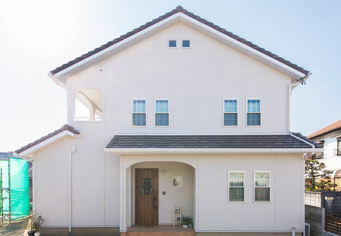 白を基調とした外観にプロヴァンスベージュ の色彩屋根が映える飽きのこない配色。 – 住協建設。
