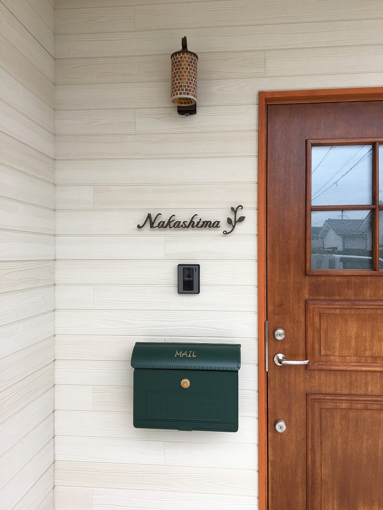 緑の玄関ドアがナチュラルな雰囲気でかわいいですね😊 建築実例 玄関 玄関ポーチ 玄関ドア ポスト 外壁 白ベージュ 緑 赤 アクセント ナチュラル かわいい 外観 エクステリア。