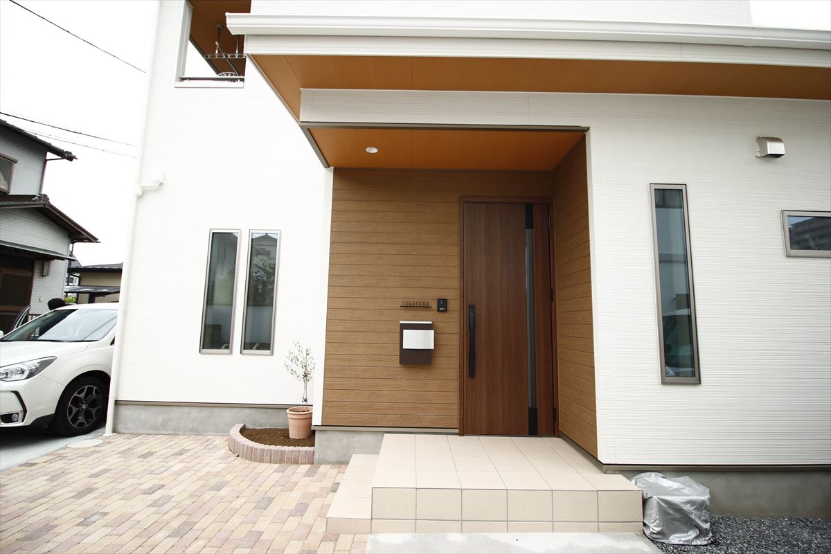 白い壁に、茶色の玄関扉がアクセントになっている外観 - 事例写真「家族が暮らしやすい家」注文住宅のハウスネットギャラリ。