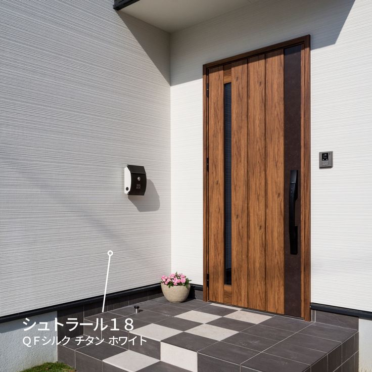白い壁とコントラストを奏でるウッド調の玄関ドア-fevecasa フェブカーサ。