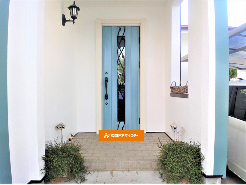 センス抜群のお客様、白い壁とバランスが良いアイスブルーノーチェのドアをお選びいただきました YKKAPドアリモE09 久喜市の事例玄関ドア・窓リフォーム全国1位の技術と価格玄関ドアマイスタ。