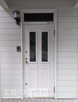 玄関ドア施工例 ランマ付玄関ドアが白い外壁に合う木目調キャラメルチークのランマ無に変更YKKAP玄関ドア交換・リフォーム専門店 玄関ドア専科。