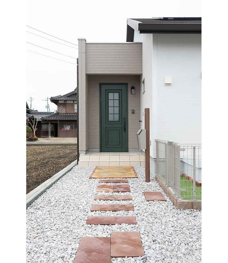 白の外壁にグリーンの玄関ドアが映え、大人かわいい外観に くふうイエタテ。