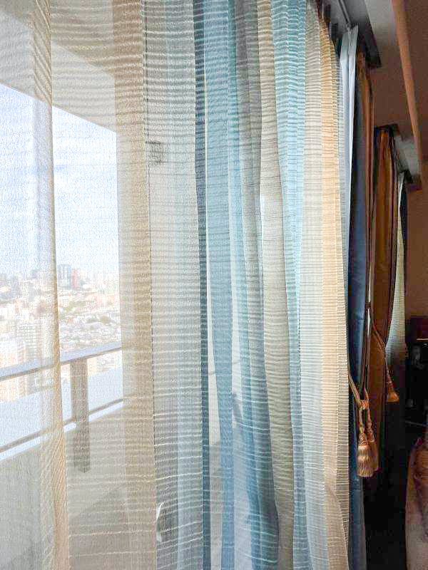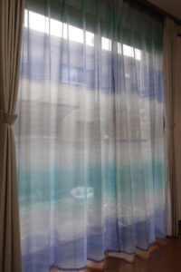 海が大好きなお客様のお宅にお取付した青いグラデーションのレースカーテンです。