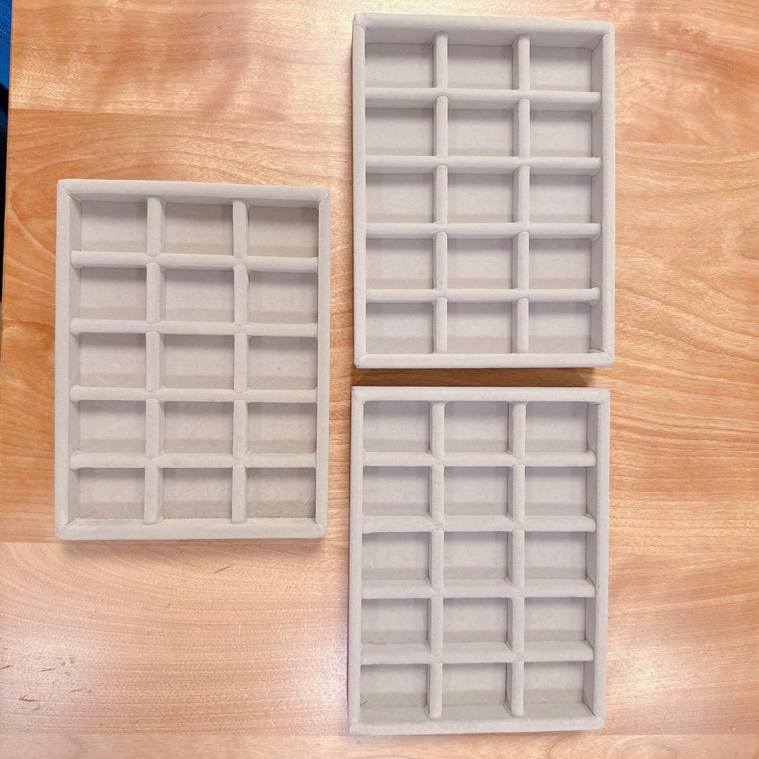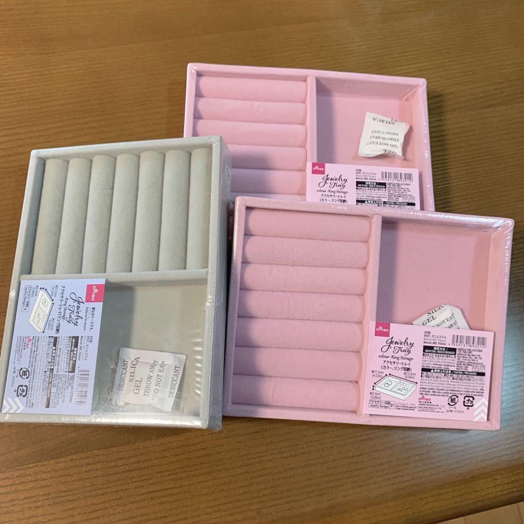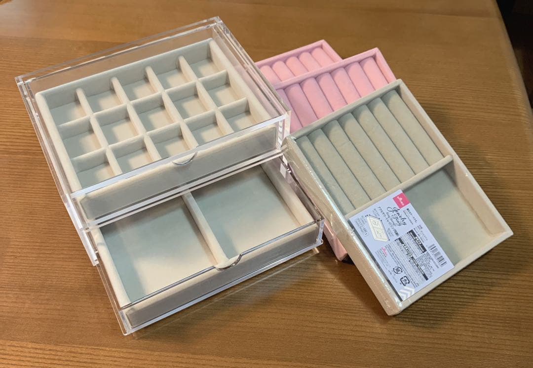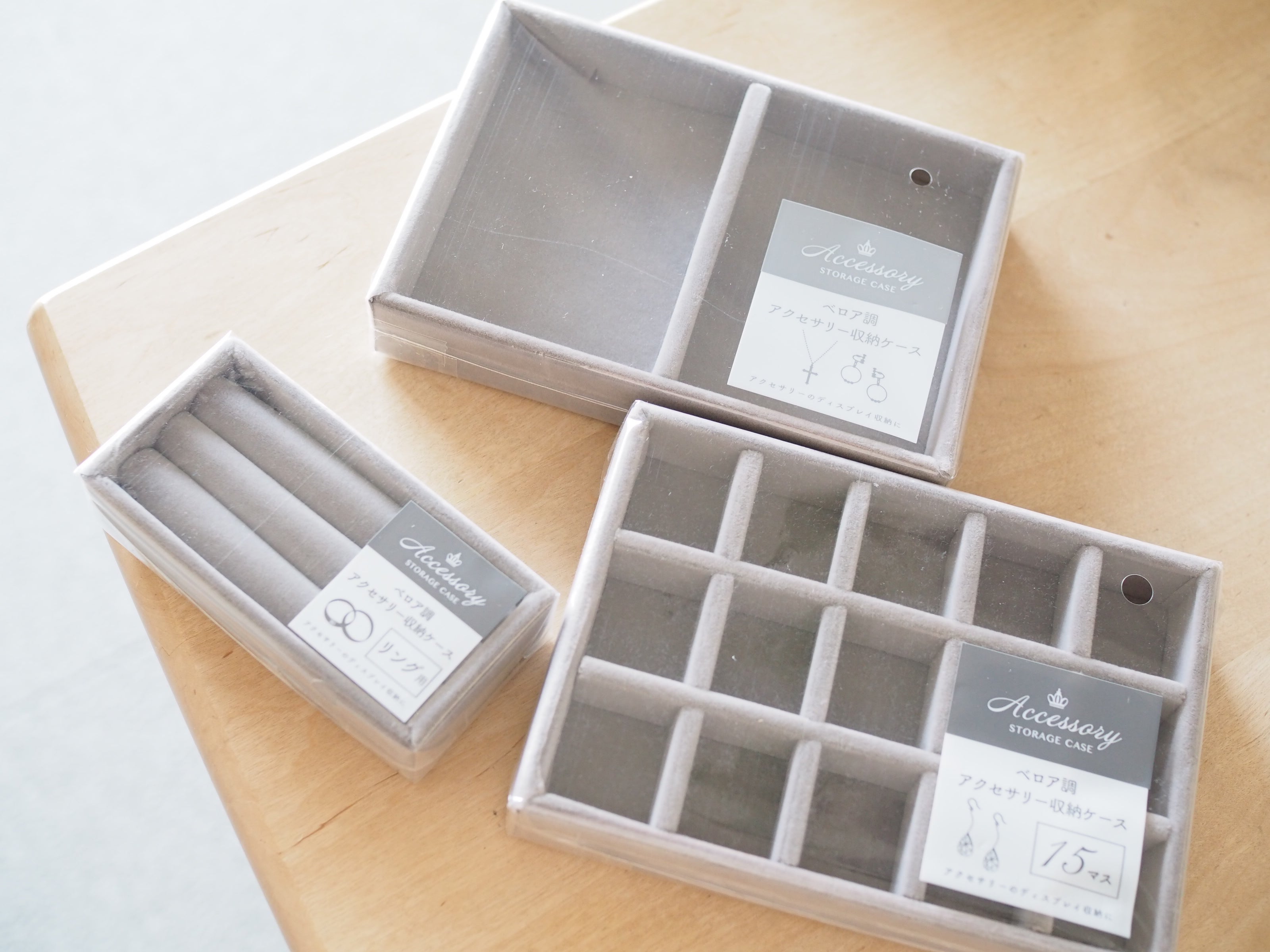 100均ダイソーのアクセサリートレイ収納例。無印良品・ベロア内箱仕切との比較をブログレポート。