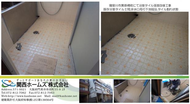 施工事例 大阪府寝屋川市にて浴室タイル,土間タイル,陥没修理,タイル張替リフォームは関西ホームズにお任せ! リフォーム 大阪 関西ホームズ株式会社リフォーム110番。