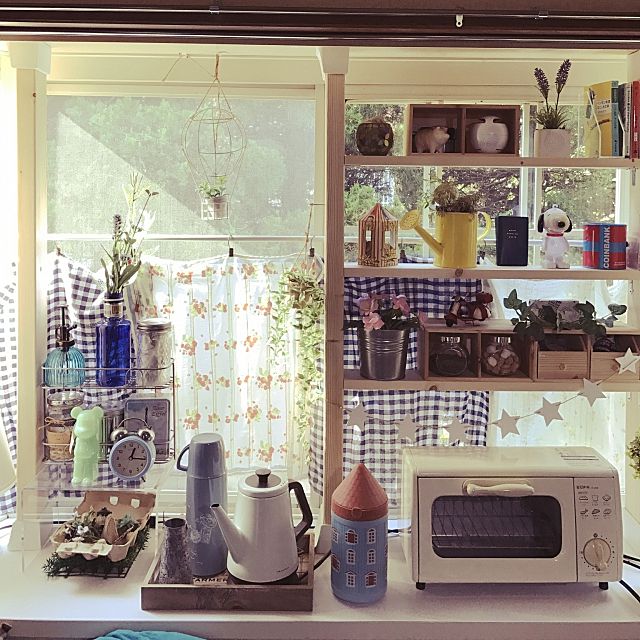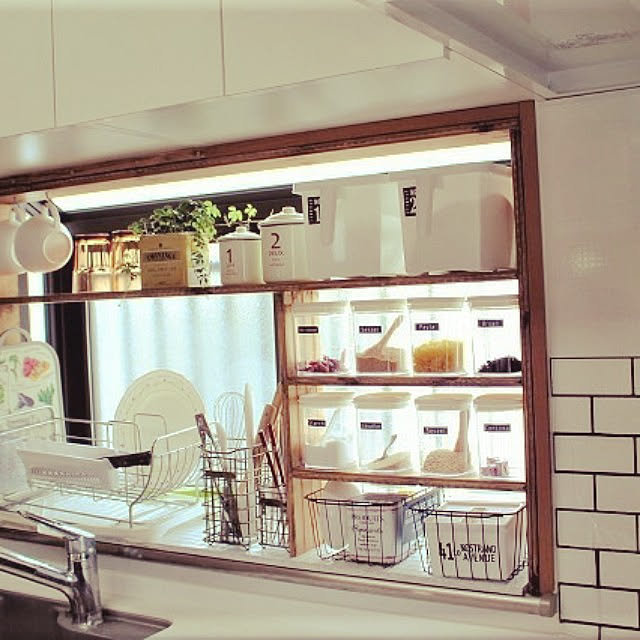 散らばりがちなキッチン!出窓を使った収納&飾り棚コーデ実例☆。