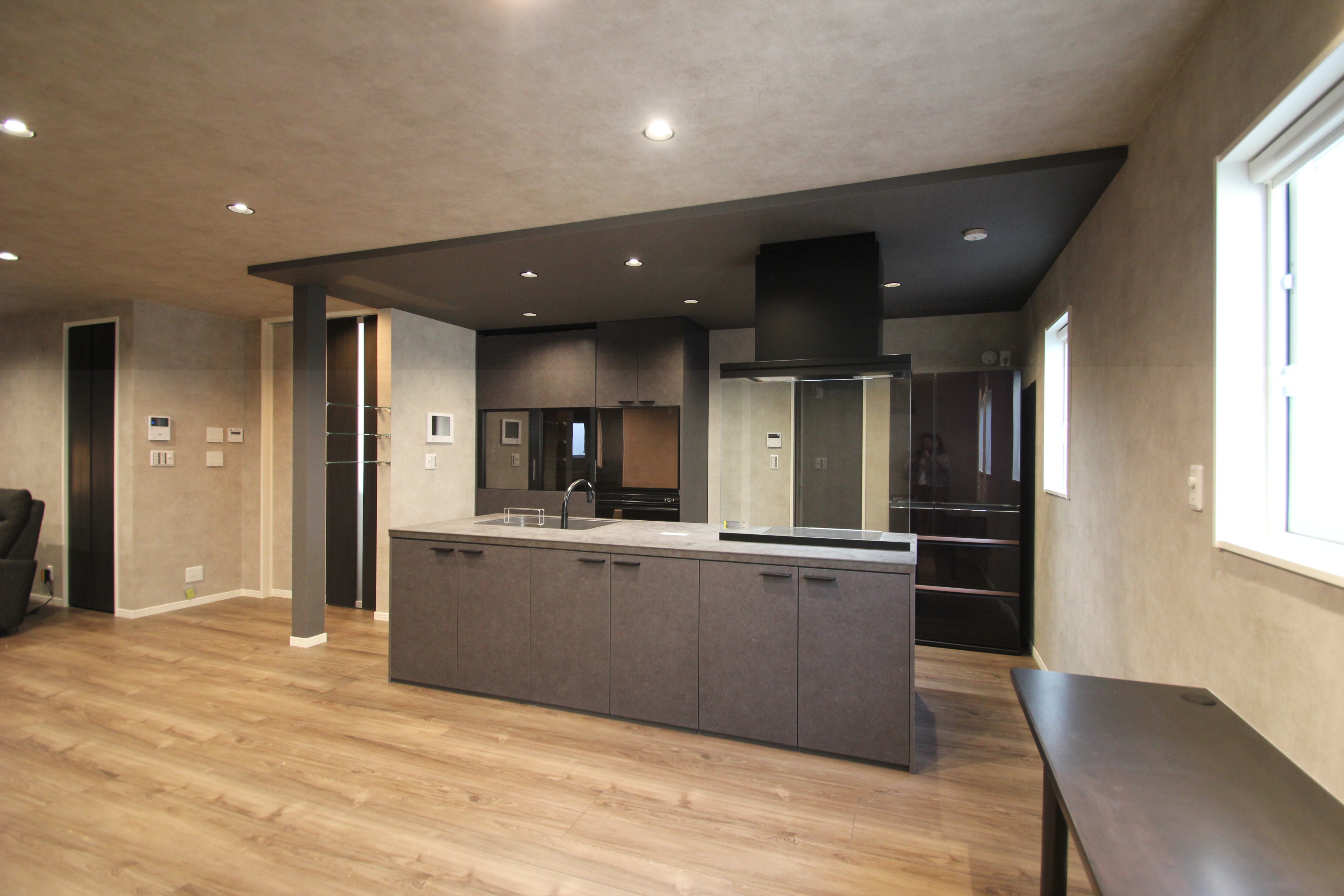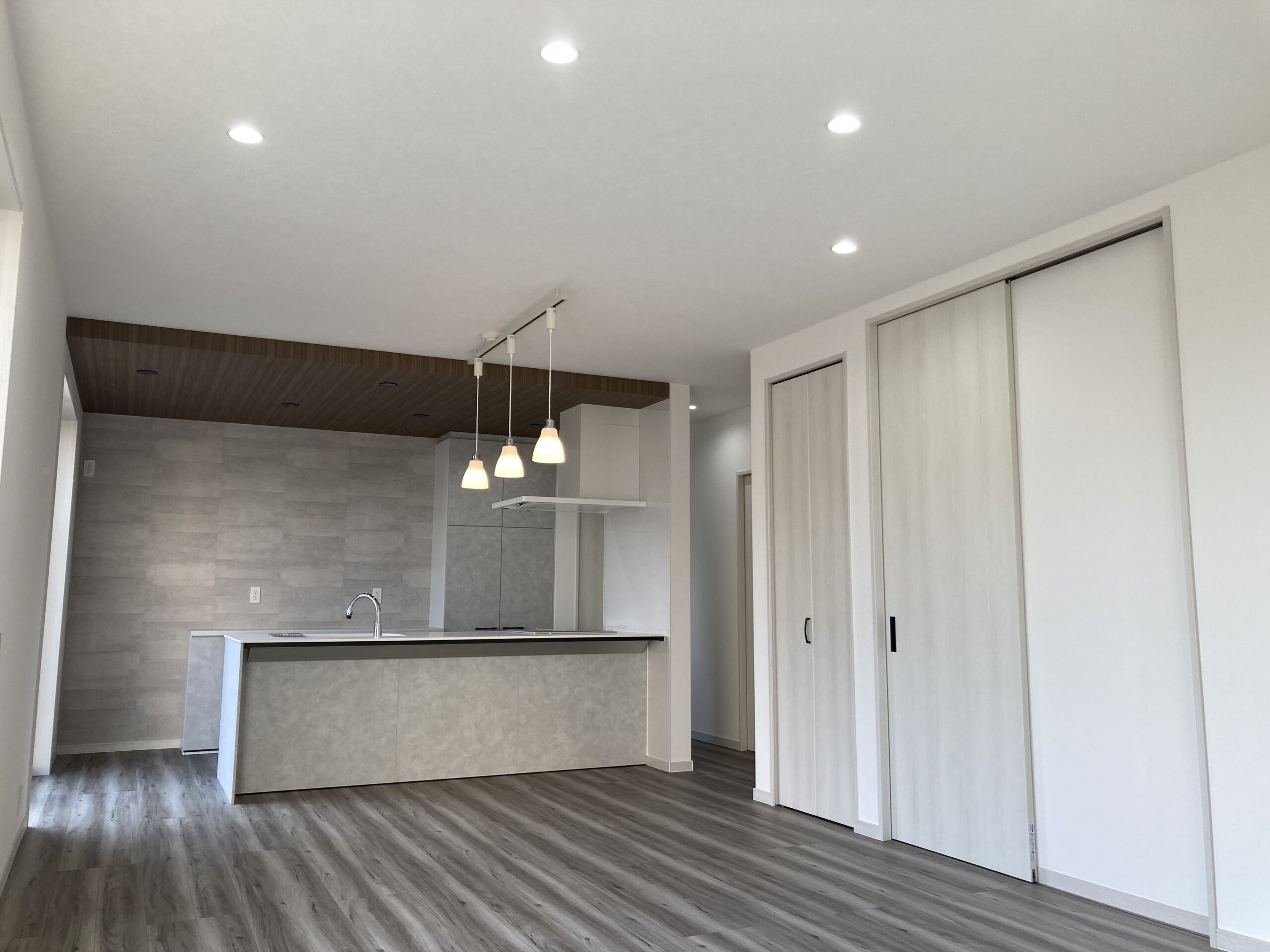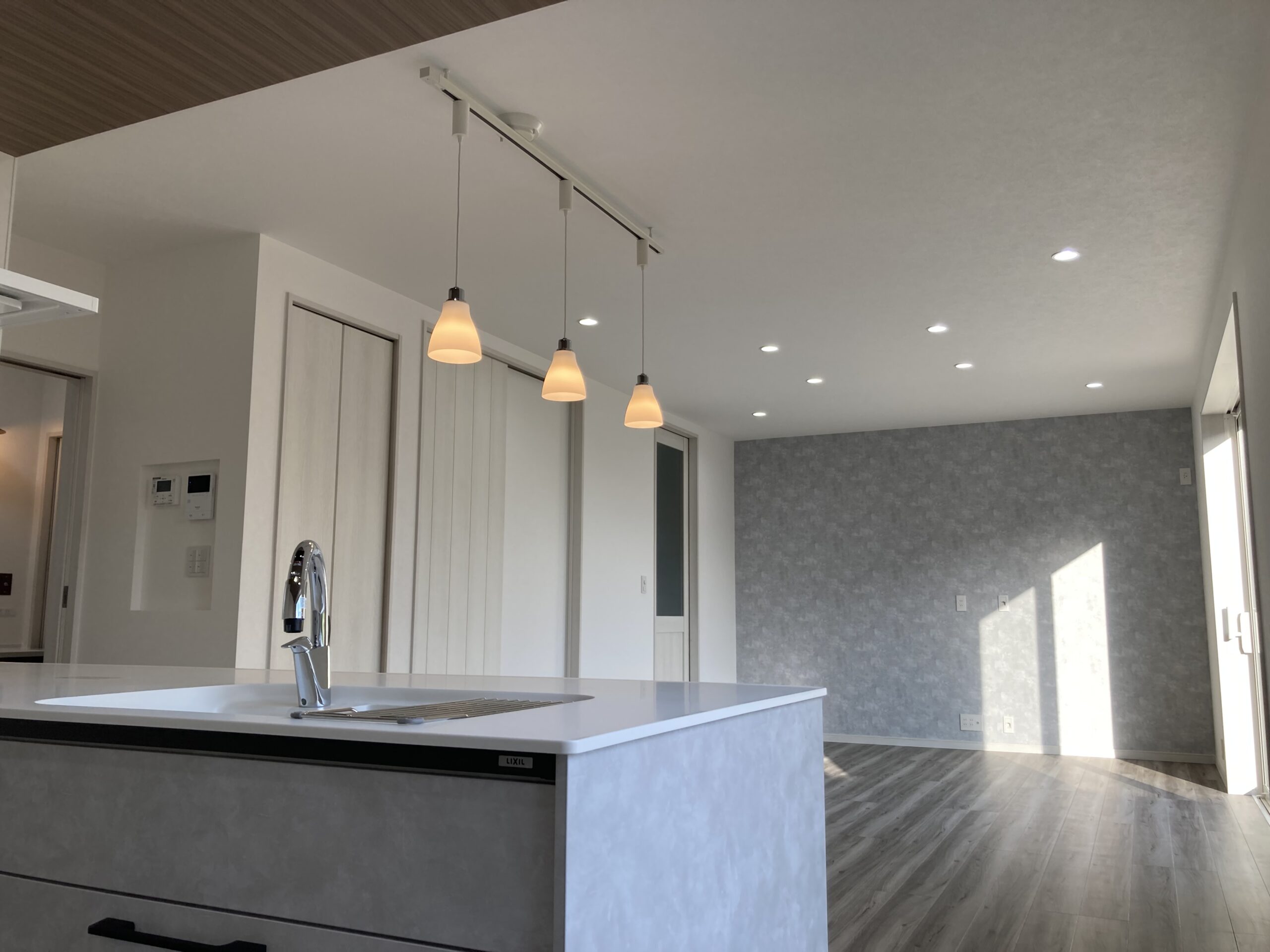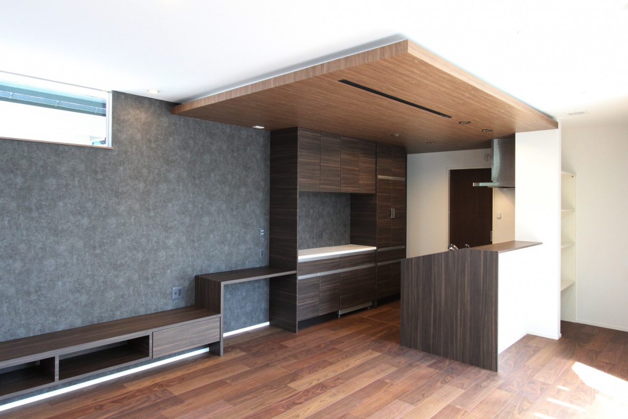 折り下げ天井キッチンやダイニングの天井を通常の天井より下げて木目調のクロスを施工するスタイルが人気です モデルハウスでご見学いただけます折り下げ天井間接照明下り天井木目調クロスリリカラサンゲツグレーグレークロスグレーキッチンタカラ。