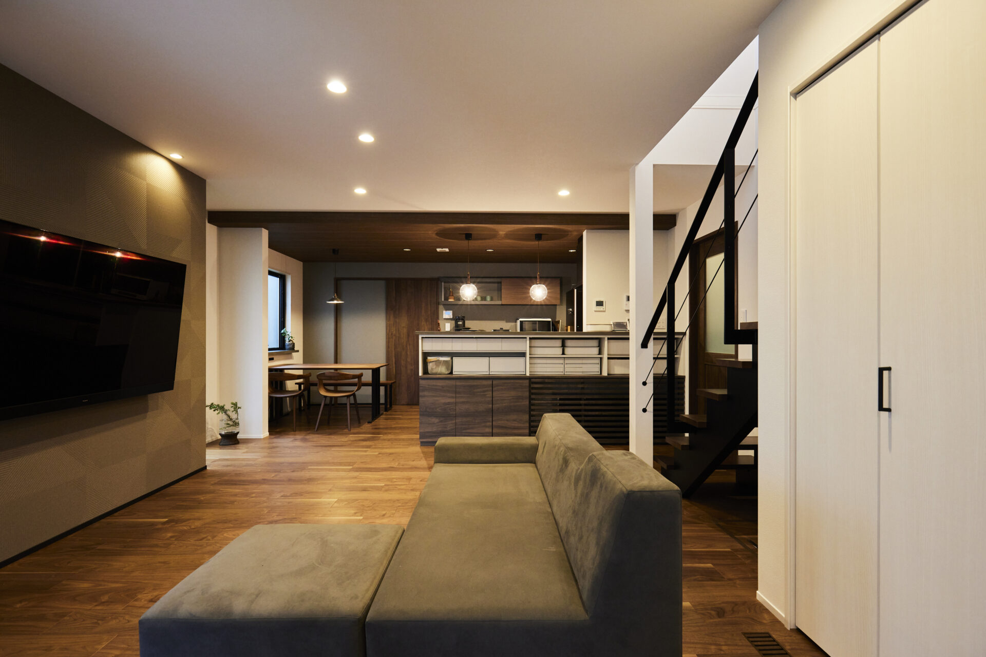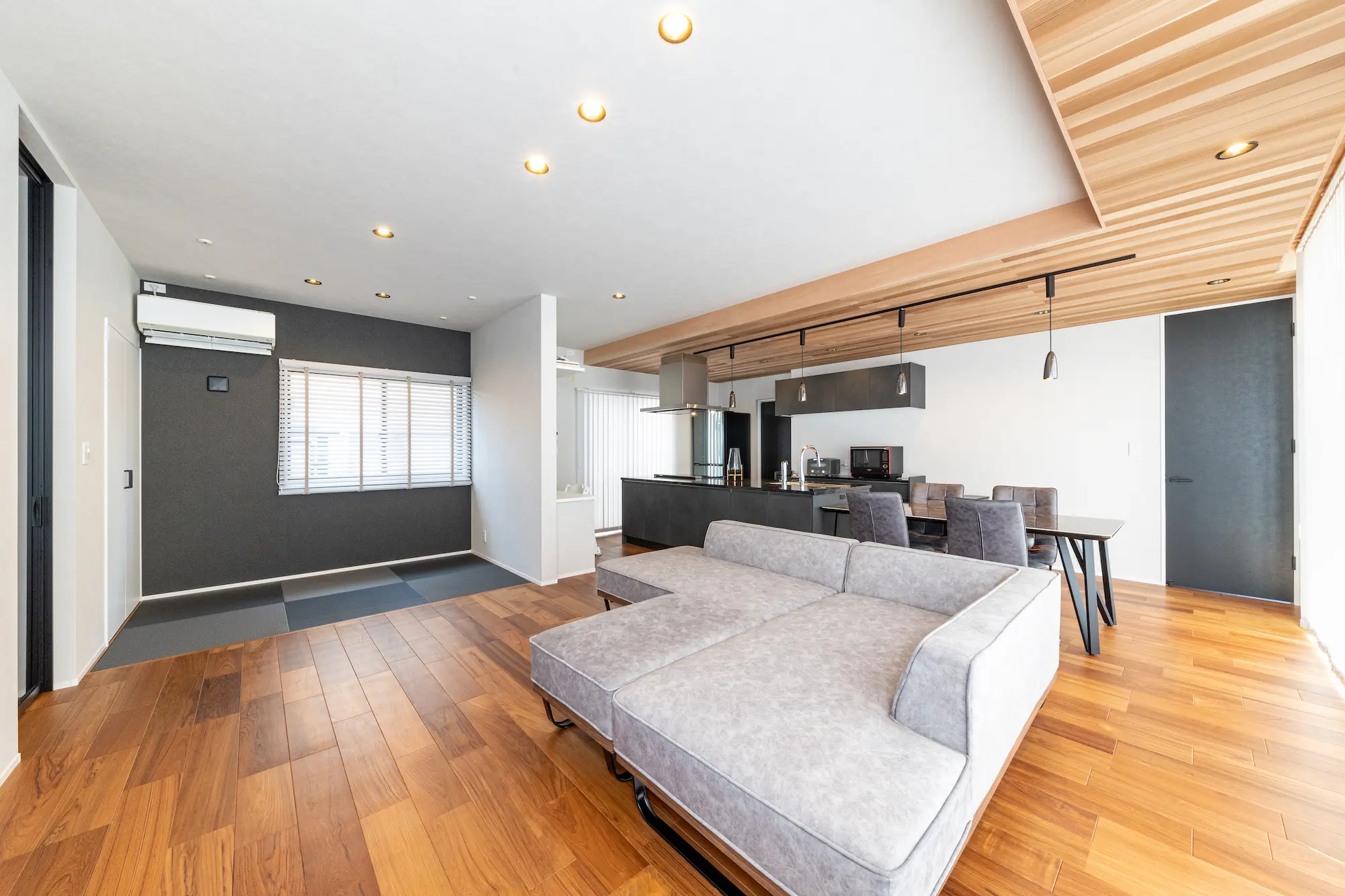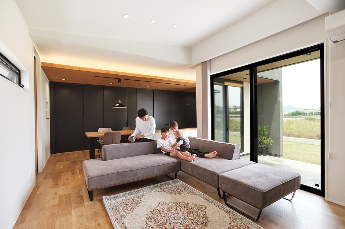 ワイドなLDKと折り下げ天井シックなアクセントクロスの家住まい施工例千葉県旭市の地域密着工務店 鈴木建設。