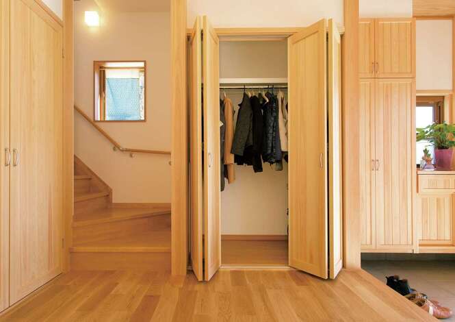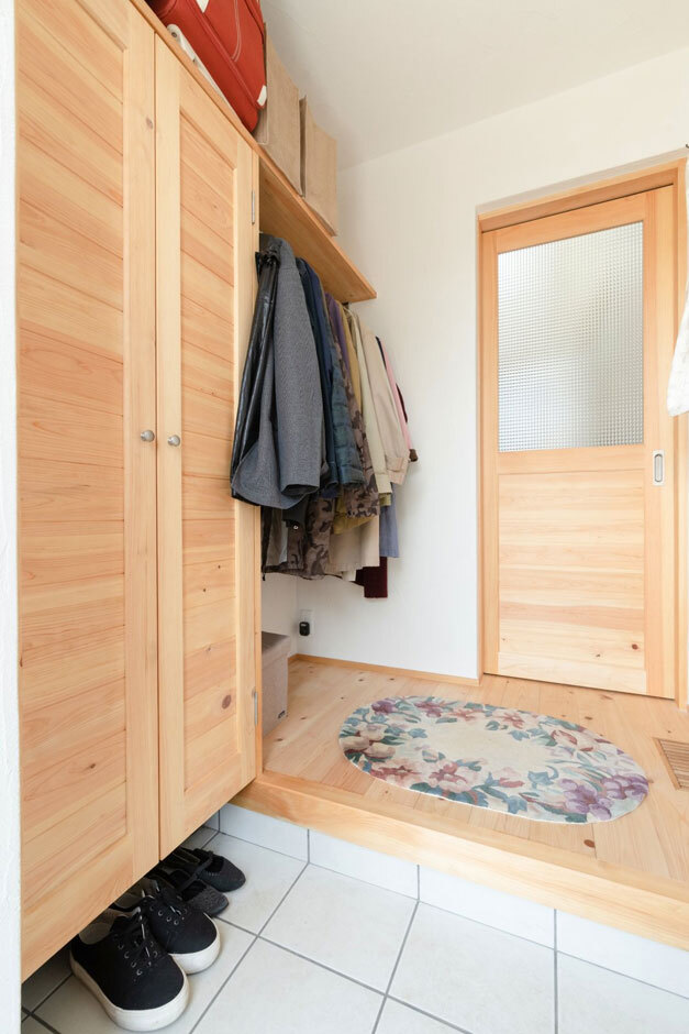 玄関にある収納はコート掛けもついていてスッキリと - 事例写真「手造りキッチンと内壁板張りの家」注文住宅のハウスネットギャラリ。