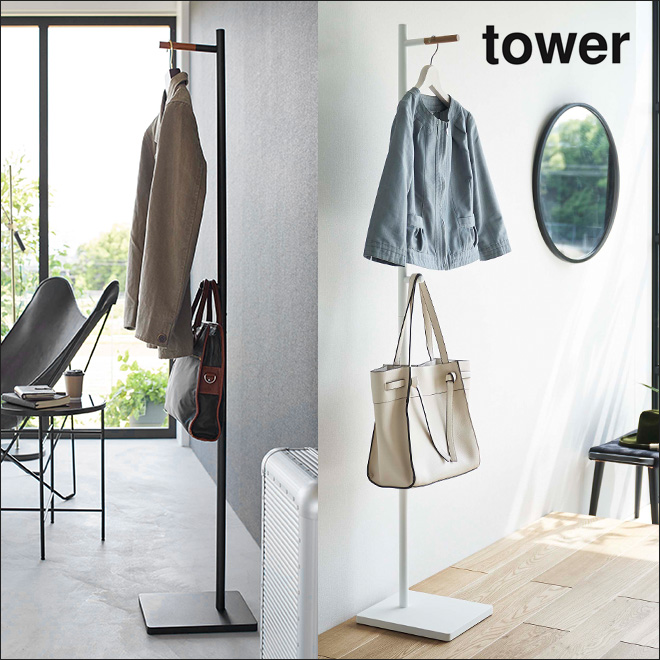 エントランスコートハンガー タワー 山崎実業 5912 5913 tower コートハンガー スリム 上着掛け 洋服掛け 玄関収納 見せる収納 バッグカバン おしゃれ 木目 省スペース スマート 耐荷重5kg インテリア オフィス リビング コンパクト シンプル モダン ブラック ホワイトの。