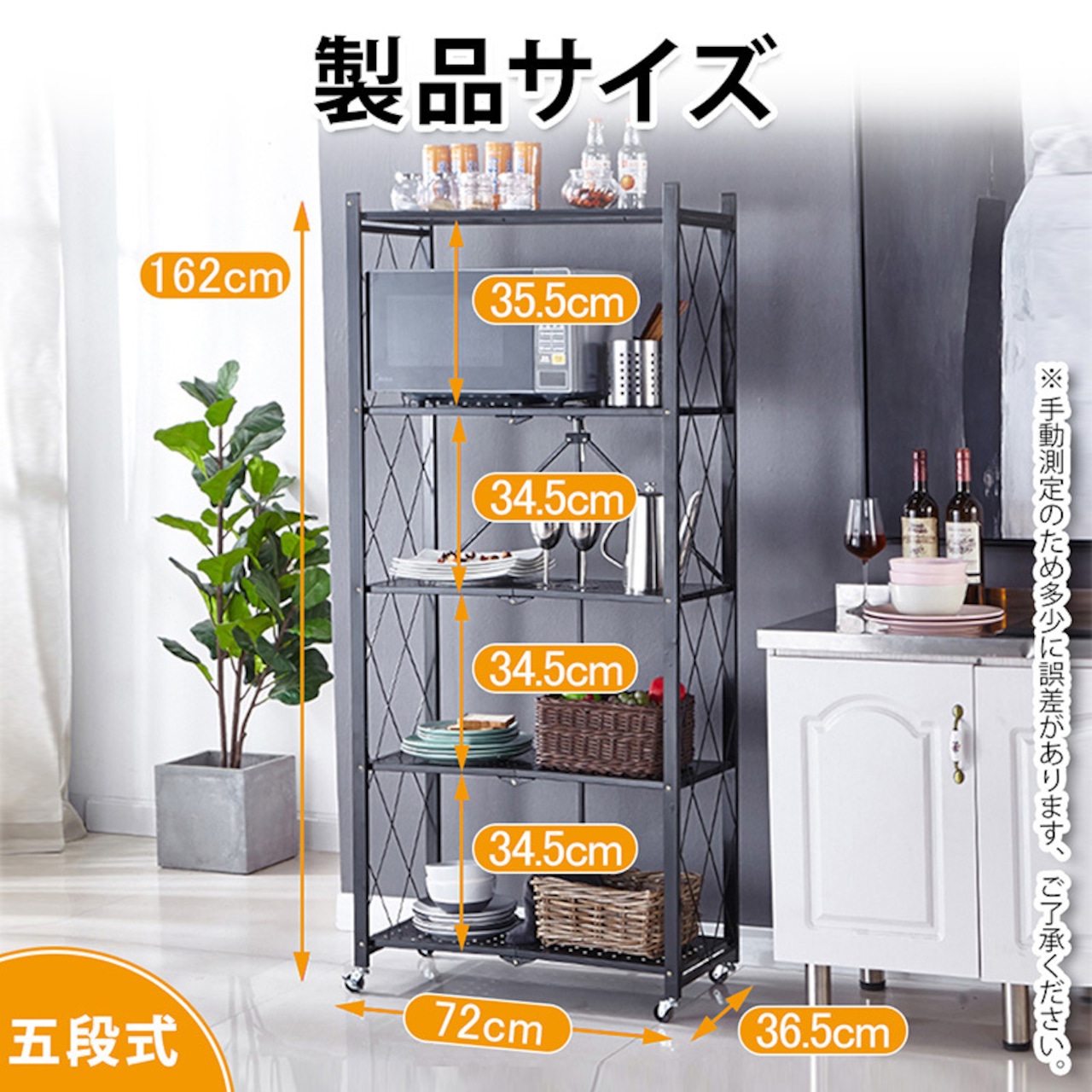スチールラックラック 5段 折りたたみ キャスター付き 幅71 おしゃれ 幅34 黒 白 キッチンラック レンジ 組み立て簡単 高耐荷重折り畳み式メタルラック 棚 5段 収納ラック 折り畳み式 スチールラック 71*34*156cm キャスター付き 収納棚 食器棚 大。