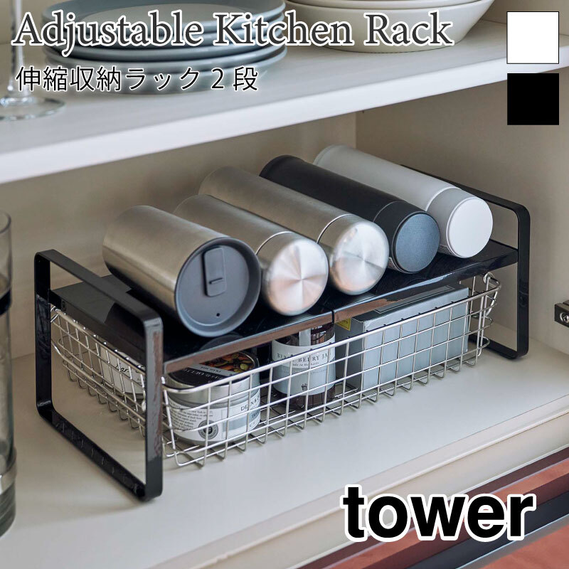 山崎実業 公式販売店 tower 伸縮収納ラック 2段 タワー 収納ラック 伸縮 幅調節 スチールラック キッチンラック 食器棚 調理家電 ラック食器 ボトル TOWER 5399 5400 箱入り ラッピング。